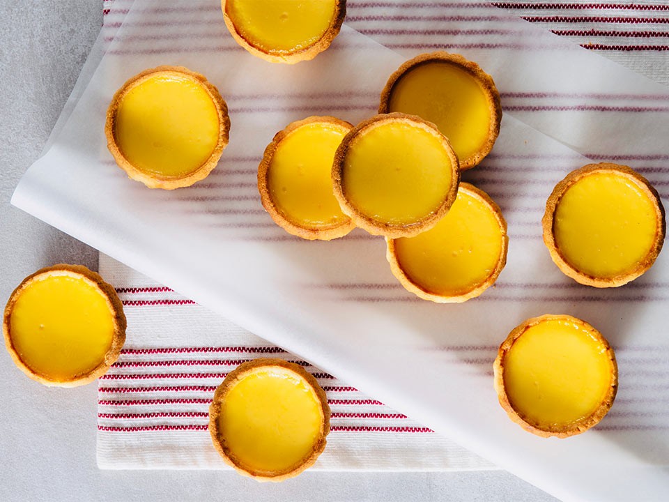蛋塔 蛋塔由英式蛋塔演變而成,分為餅皮及酥皮兩種。餅皮蛋塔在麵包店較常見,酥皮則較常在點心店出現,兩種蛋塔難分高下,各有捧場客。 蛋塔還有葡式的變奏,起泡的蛋漿表面烤至棕色,並一定選用酥皮,是澳門特產之一。葡式蛋塔源於13 世紀的葡萄牙里斯本,相傳因為當時使用蛋白洗衣,剩餘的蛋黃過多,方用來製成甜品。