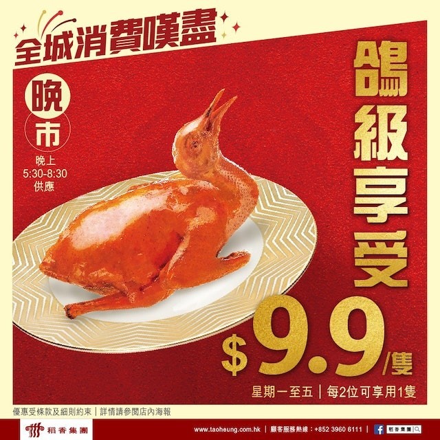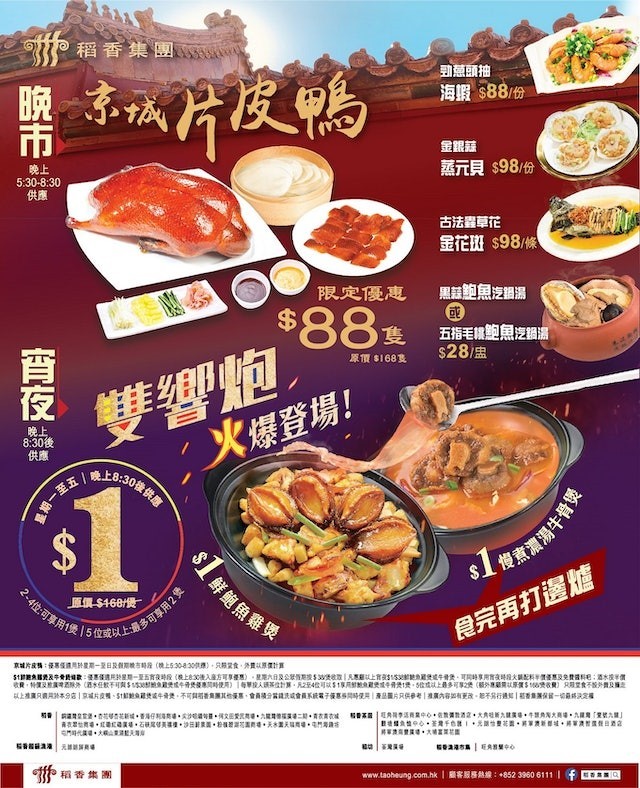 每逢星期一至星期日下午5時30分至8時30分,到全港共30間稻香、稻香茶居、稻坊、稻香漁港市集和稻香超級漁港分店堂食,即可以88元吃到皮脆肉嫩的京城片皮鴨,配秘製醬汁、青瓜條及京蔥絲,加多一隻僅需要68元。 除了片皮鴨,晚市優惠菜式包括頭抽海蝦(88元/份)、金銀蒜蒸元貝(98元/份)、古法蟲草花金花斑(98元/條)、黑蒜鮑魚汽鍋湯或五指毛桃鮑魚汽鍋湯(28元/盅)。 宵夜時段同樣亦有優惠,逢星期一至五晚上8時半後,到全港共30間稻香、稻香茶居、稻坊、稻香漁港市集和稻香超級漁港分店堂食,2人同行即可以1元優惠價購買鮑魚雞煲或慢煮濃湯牛骨煲! 稻香優惠|晚市京城片皮鴨優惠 推廣地點:全線稻香、稻香茶居、稻坊、稻香超級漁港、稻香漁港市集分店 優惠時段:星期一至日17:30-20:30 費用已包醬料及麼麼皮(如需加配則另作收費) 只限堂食,外賣及攜走以原價168元/隻計算