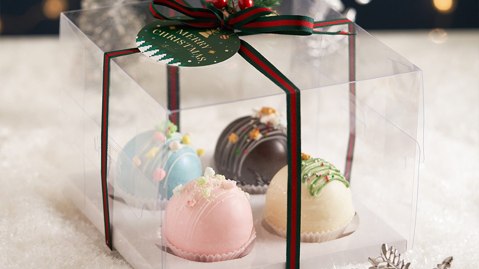 聖誕朱古力球禮盒,包括榛子朱古力、士多啤梨玫瑰、特濃朱古力及抹茶拿鐵味。(原價:$208/早鳥優惠:$188) 派對必備美食 如果正為聖誕派對準備食品,不妨考慮備有3種尺寸的白色聖誕村莊蛋糕,蛋糕以朱古力海綿蛋糕及布朗尼作餅底,配搭伯爵茶慕絲,加入朱古力薄脆,淡淡茶香、甜而不膩。另有3款聖誕甜品塔:馬卡龍、冬甩或瑪德蓮,色彩奪目,打卡一流,又易於分享!