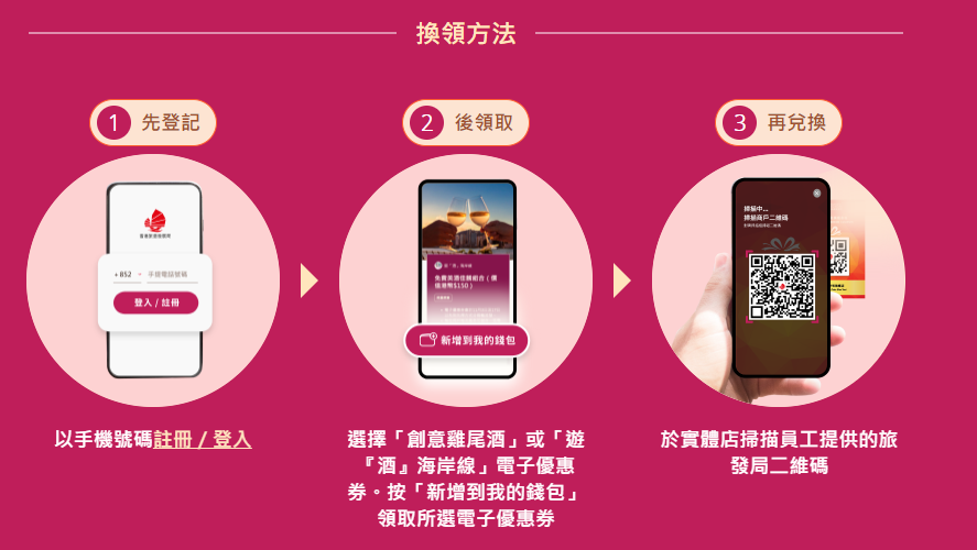有興趣的市民可進入活動網站登記帳戶,在“創意雞尾酒”或“遊『酒』海岸線”電子優惠券中二選一,領取電子優惠券到個人帳戶。不過要注意的是,每位用戶只可在“我的錢包”中同時儲存最多1份限量獎賞,如果“我的錢包”已存滿1份限量獎賞,必須先兌換,方可再領取其他限量獎賞。所有限量獎賞自領取(即“新增到我的錢包”)至11月30日期間有效。