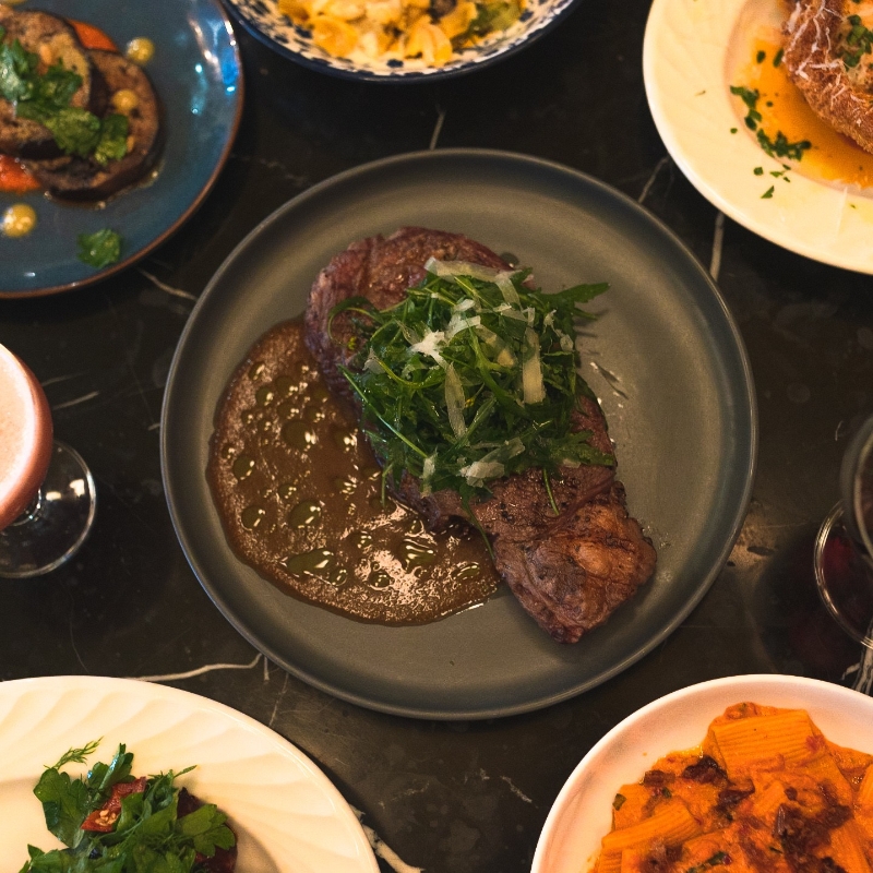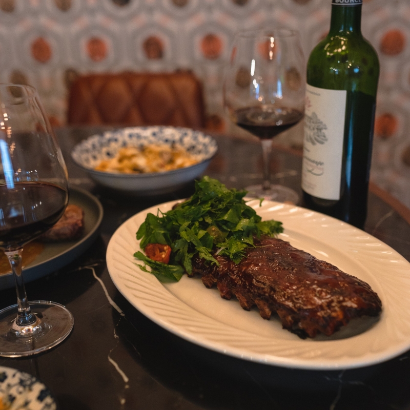 Frank's Italian American Social Club Frank's內的牆身及室內設計蘊藏小心思,通往1樓的樓梯牆身貼滿印有多位Hip Hop歌手漫畫肖像牆紙,隨著經典音樂響起,客人恍如置身時光隧道。1樓的佈局和裝飾洋溢現代風格,以白色為主,客人可於此層品嚐各款由集團總廚Chef Vinny推介的精緻美式意大利菜式。 無肉不歡的朋友,推薦品嘗Frank's Italian American Social Club的牛肋肉與豬肋骨,前者配以Frank's特別調製的喼汁,後者則配合香辣蜂蜜大蒜醬,惹味香口。另外,混合了牛肉與龍蝦肉的肉丸層次豐富,佐以美酒讓人欲罷不能。亦可以一嚐菜單上的水牛城椰菜花及焗味噌茄子,多樣的蔬菜選項讓美食體驗得以完滿。