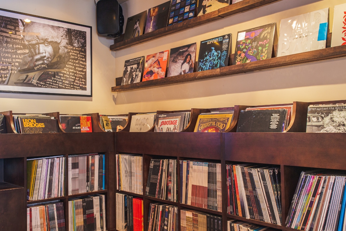 Frank's豬肋骨配香辣蜂蜜大蒜醬 Frank's Record 座落7樓的Frank's Record是一個收藏經典Hip Hop黑膠唱片的集中地,此層展示了大量搖滾樂、爵士樂、騷靈音樂、雷鬼音樂和電子樂的黑膠唱片。同時提供特色雞尾酒與輕食。與1樓的Frank's Italian American Social Club一樣,Frank's Record同樣以美式意大利菜的喜好為基礎,如意大利風乾火腿Crostini配以開心果及參峇辣椒醬、以及煙燻沙丁魚Crostini 或意大利軟包。