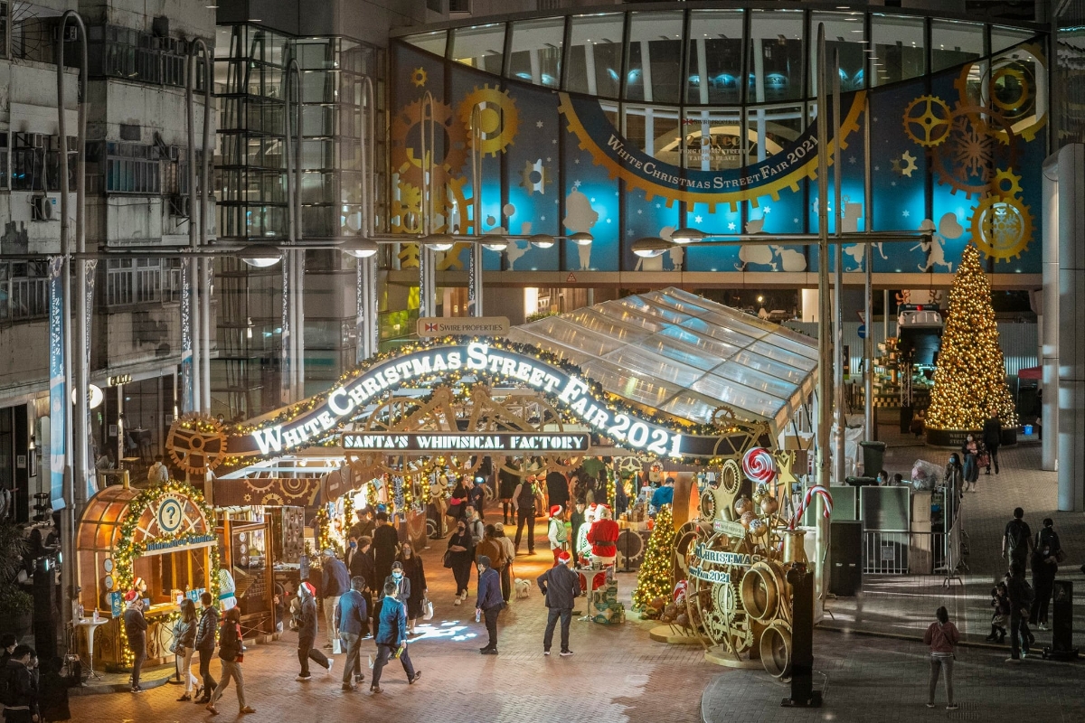 2021糖廠街白色聖誕市集現場(圖片:太古地產) 場內更提供由香港東隅酒店、糖廠街餐廳enoteca、Pici等餐飲品牌製作的冬日美食,包括芥末蜜糖火腿漢堡、意大利提拉米蘇芝士蛋糕,香料熱紅酒等;亦可以參加2大聖誕市集工作坊,親手製作“聖誕微型花園”及“迷你聖誕花環”,送禮或自用都為不錯的選擇。