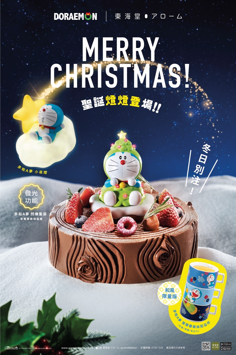 多啦A夢“閃爍聖誕” - 草莓黑森林蛋糕 多啦A夢以聖誕樹造型現身於樹頭造型的黑森林蛋糕,面層鋪有草莓、藍莓及紅桑子,夾層鬆軟朱古力蛋糕,配以甘那許、朱古力忌廉及黑朱古力脆珠,味道香濃醇滑又充滿酥脆感。 零售價:$329/個;會員優先預訂85折:$279.7/個(12月19日或之前);非會員優先預訂88折:$289.6/個(12月19日或之前) 多啦A夢陶瓷甜品杯、小夜燈 另外亦有多啦A夢和風限量版層層疊陶瓷甜品杯,3款口味有草莓、芒果及朱古力,儲齊3款可以層層疊起,再合併成獨特的圖案,極具收藏價值及實用性。此外,購買任何多啦A夢產品,即可以$259換購聖誕限定之多啦A夢小夜燈。