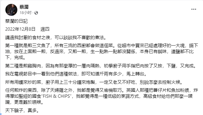 第二種則是煎雞胸肉,因為有那麼厚的一層肉隔熱,初學廚子用手指把肉按了又按,下鹽,又完成。蔡瀾稱,“在電視節目中一看到他們這種做法,即可知道斤兩有多少,馬上轉台。”強調所有用鑊來炒的菜,廚子用上30分鐘來炮製,一定又老又不好吃,別說怎麼去控制火候。 至於煎炸的東西,蔡瀾認為,除了天婦羅之外,他都覺得偷機取巧。吐槽“英國人那種把薯仔片和魚加粉漿,炸得厚如聖經的國食FISH & CHIPS,我都覺得是一種低級的烹調方式,高級食材給他們那麼一蹂躪,更是難於嚥喉。” 其後,有網友留言詢問蔡瀾應該如何處理三文魚,蔡瀾回覆稱:“大西洋的,蘇格蘭的,都生吃為佳。” 【編輯:刘春】