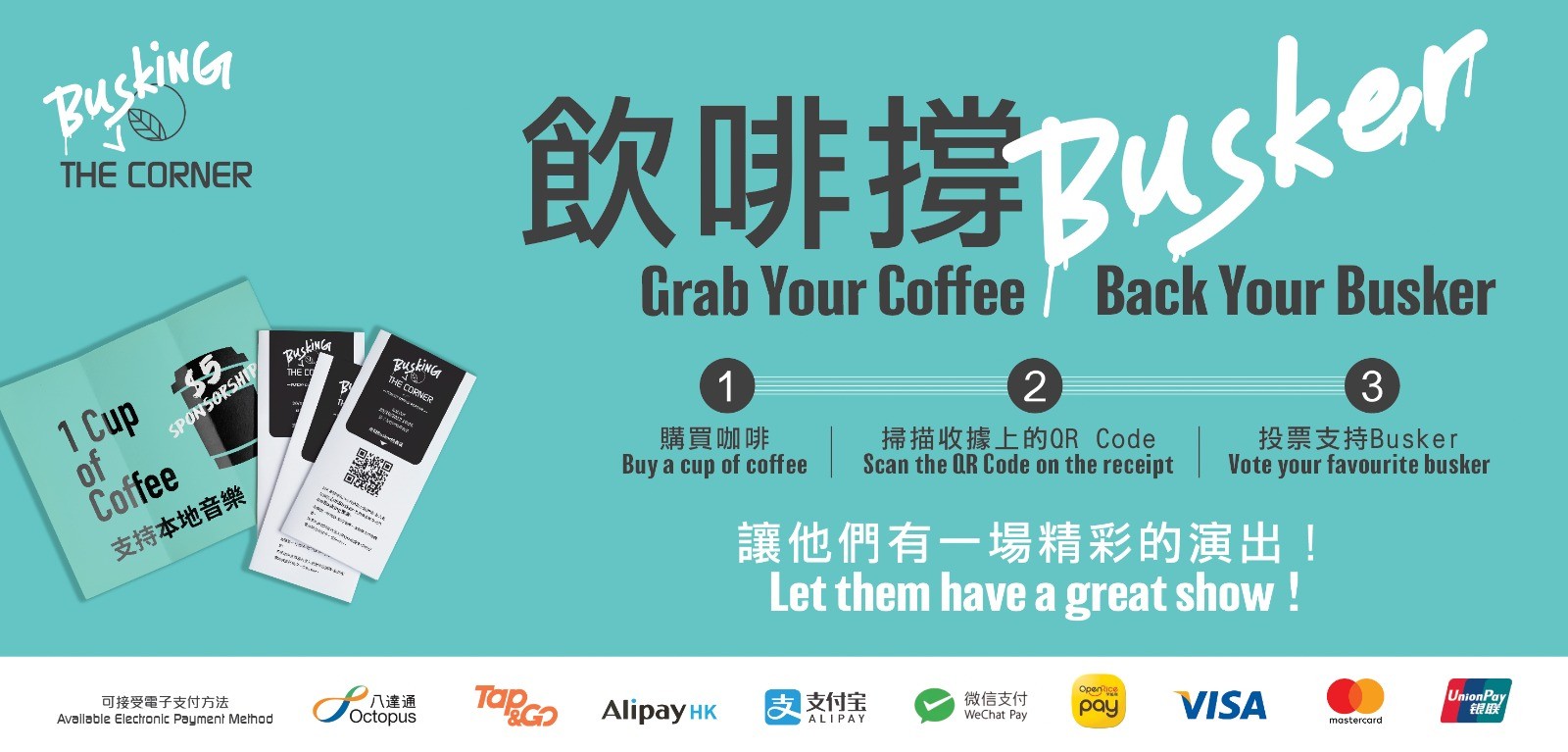 The Busking Corner位於中環街市(圖片:品牌提供) 為推廣本地街頭音樂文化,The Busking Corner於每季都會介紹8名Busker(街頭表演者)予大眾。當顧客惠顧The Busker Corner購買一杯飲品,可以透過掃描收據上的QR Code觀看8名Busker的演出片段,並利用手上的一票支持他們欣賞的Busker。當Busker得到足夠票數後,該店會支持他們舉辦Busking表演,實行“飲啡撐Busker”的概念。