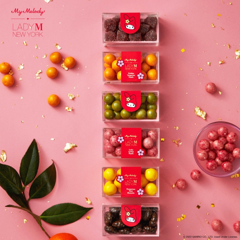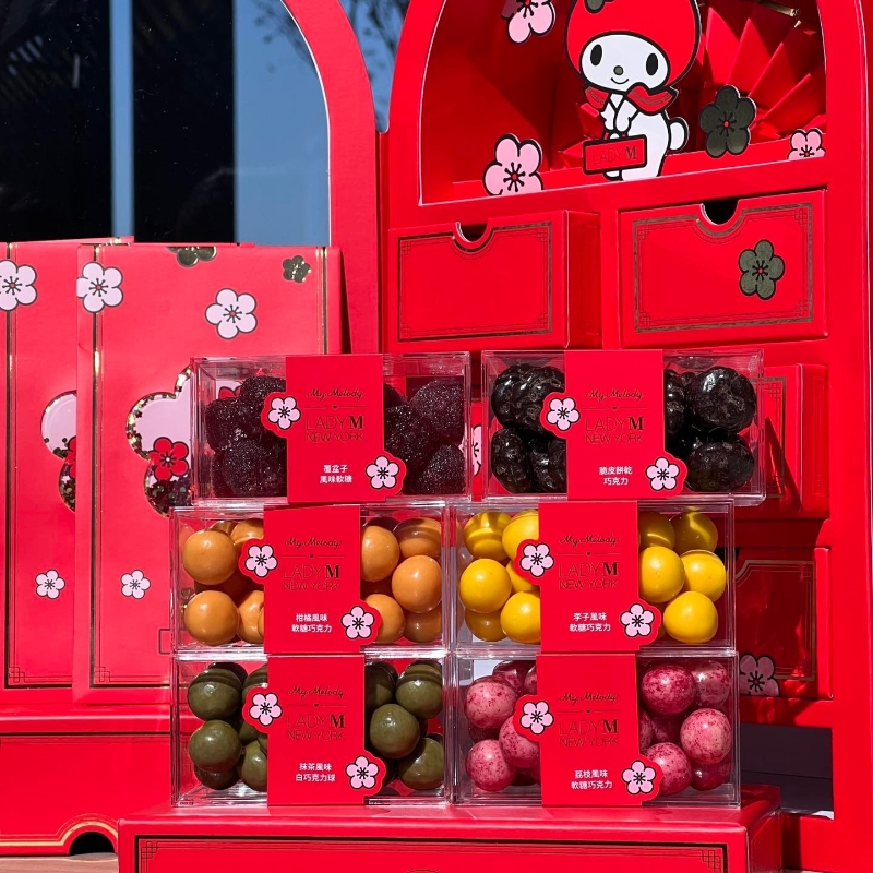 My Melody新春糖果禮盒的6個抽屜,包含6款新年特別款Lady M糖果:柑橘朱古力、梅子朱古力、脆皮餅乾朱古力、荔枝朱古力、抹茶白朱古力及備受歡迎的覆盆子啫喱軟糖;而最底層的抽屜擺放了My Melody利是封,輕輕一搖中央的閃閃亮片,倍添節日氣氛! 每個禮盒均配以同一系列的新春手提袋,並附有心意卡為親友好友送上新年祝福,喜迎兔年! 現貨及禮券現於Lady M全線分店發售。