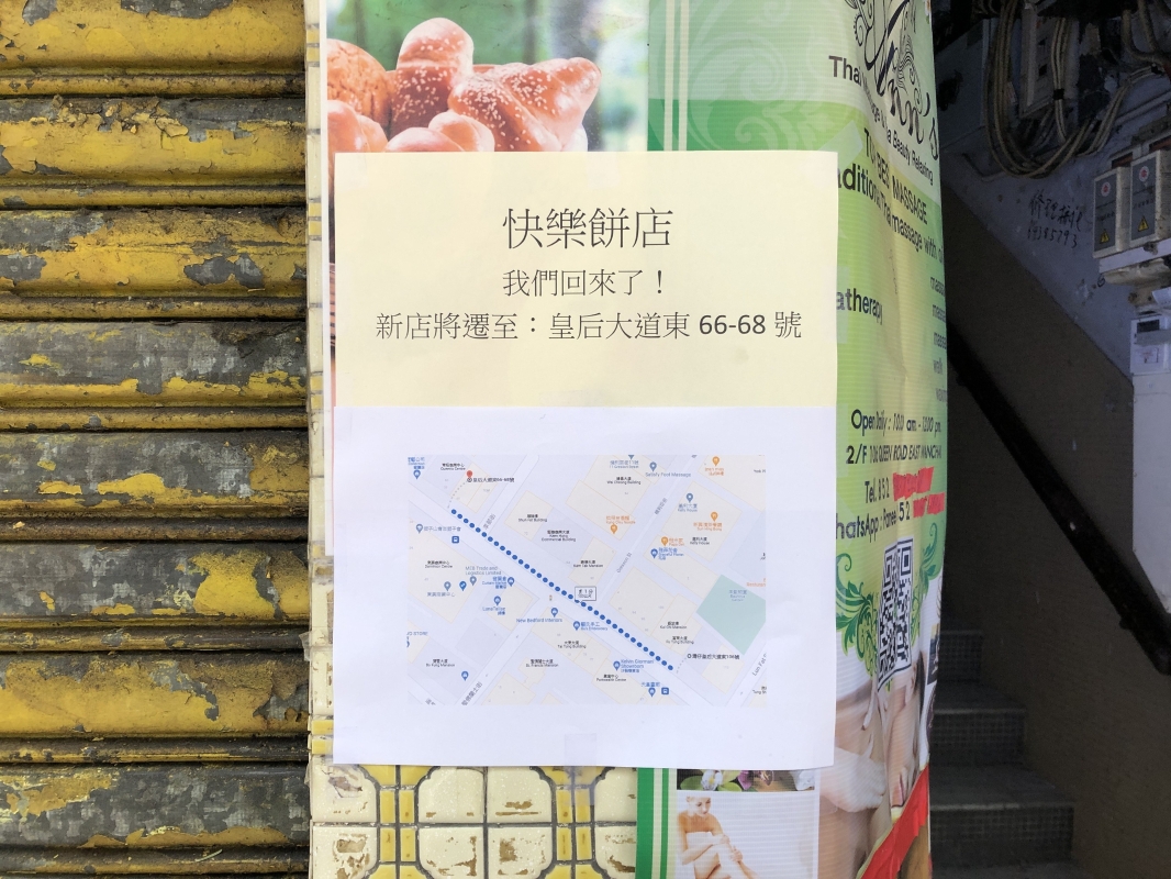 快樂餅店將在同區新址重開(圖為舊店結業前) 雖然店家在告示上未有透露歸期,但消息一出仍叫一眾街坊大感興奮。現時舊店(皇后大道東106號)亦有少量餅食售賣。灣仔街坊上班族,想重溫快樂餅店的味道,就要留意了。 快樂餅店(新址) 新店位置:灣仔皇后大道東66-68號(帝后商業中心旁) 開業日期:未定 【編輯:黃璇】
