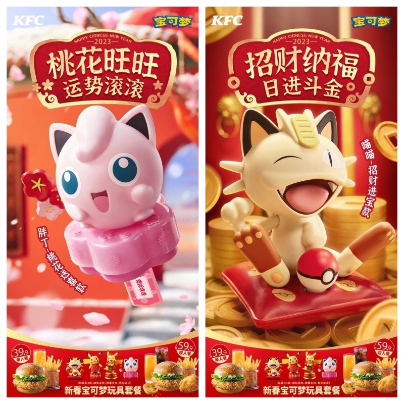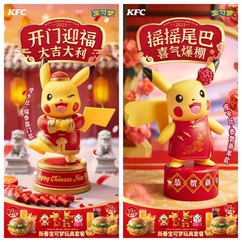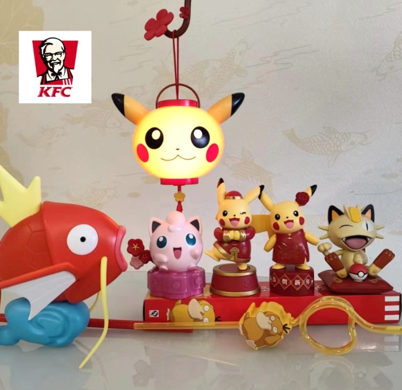 中國內地的KFC肯德基將在1月13日起推出新春Pokémon玩具,其中包括拜年皮卡丘、招財喵喵、福簽胖丁、皮卡丘印章;第二批則有皮卡丘燈籠、可達鴨飲管、皮卡丘書包等等。
