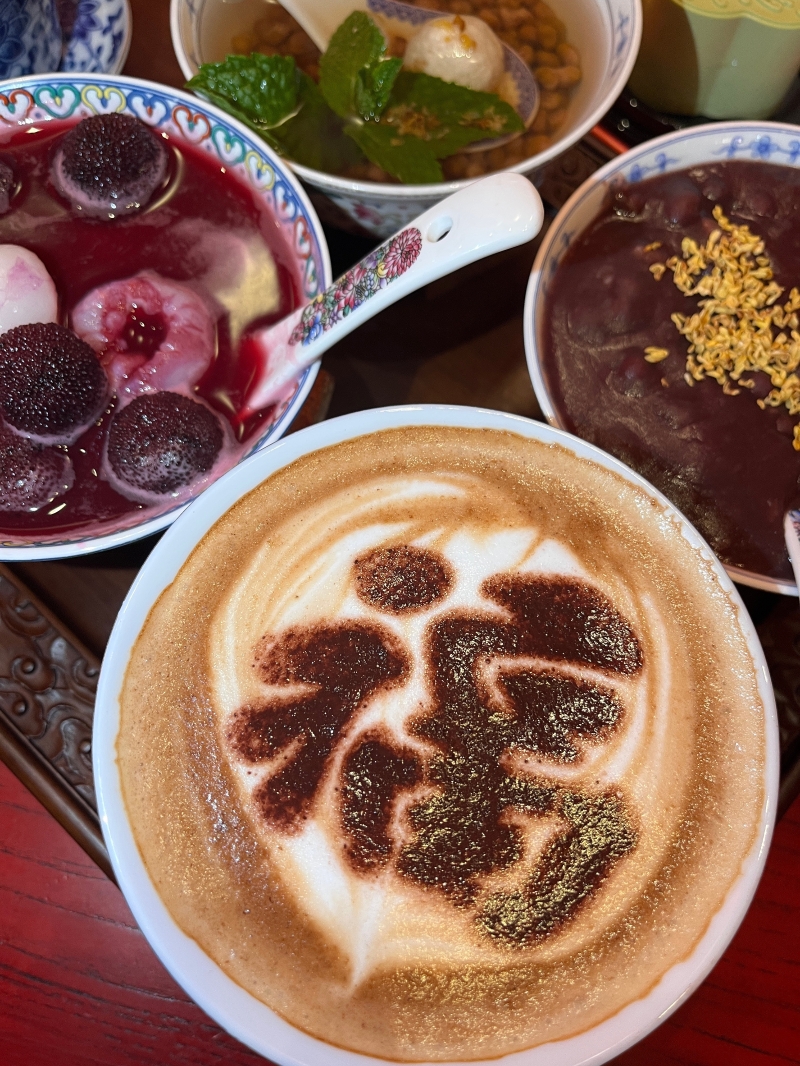 萬春金福下午茶(圖片:微博@王天白) 除了咖啡,萬春金福下午茶裏還有各種創新宮廷糖水。“酒釀綠豆清露”是由桂花糖、醪糟和綠豆湯製成的。喝起來冰冰涼涼,帶著一絲嚼勁的糯米和綿軟的綠豆讓口感更加豐富。“紅顏雪耳蓮子羹”裏有銀耳、燉得軟爛的雪梨和紅棗,如果中午不小心吃多了,可以來一碗潤潤胃。