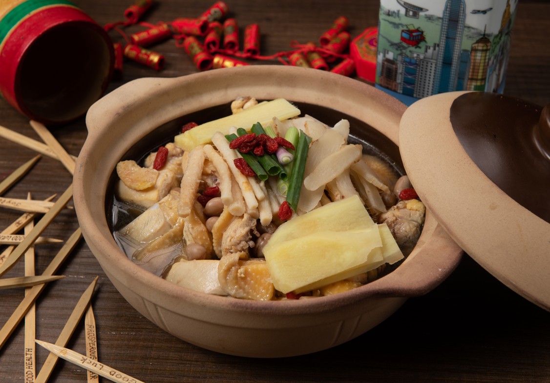 龍飛鳳舞以花雕酒烹煮雞肉 鴻運滔滔的香辣栗子肉排煲(HK$388)以自家調配香辣醬汁燜煮,栗子口感鬆軟,肉排吸收栗子香甜味,香辣風味配合得恰到好處,香濃惹味!最後推介的是金玉滿堂(HK$288)用上新鮮爽脆萵筍、白果、百合等,清甜開胃。 新春賀年禮籃