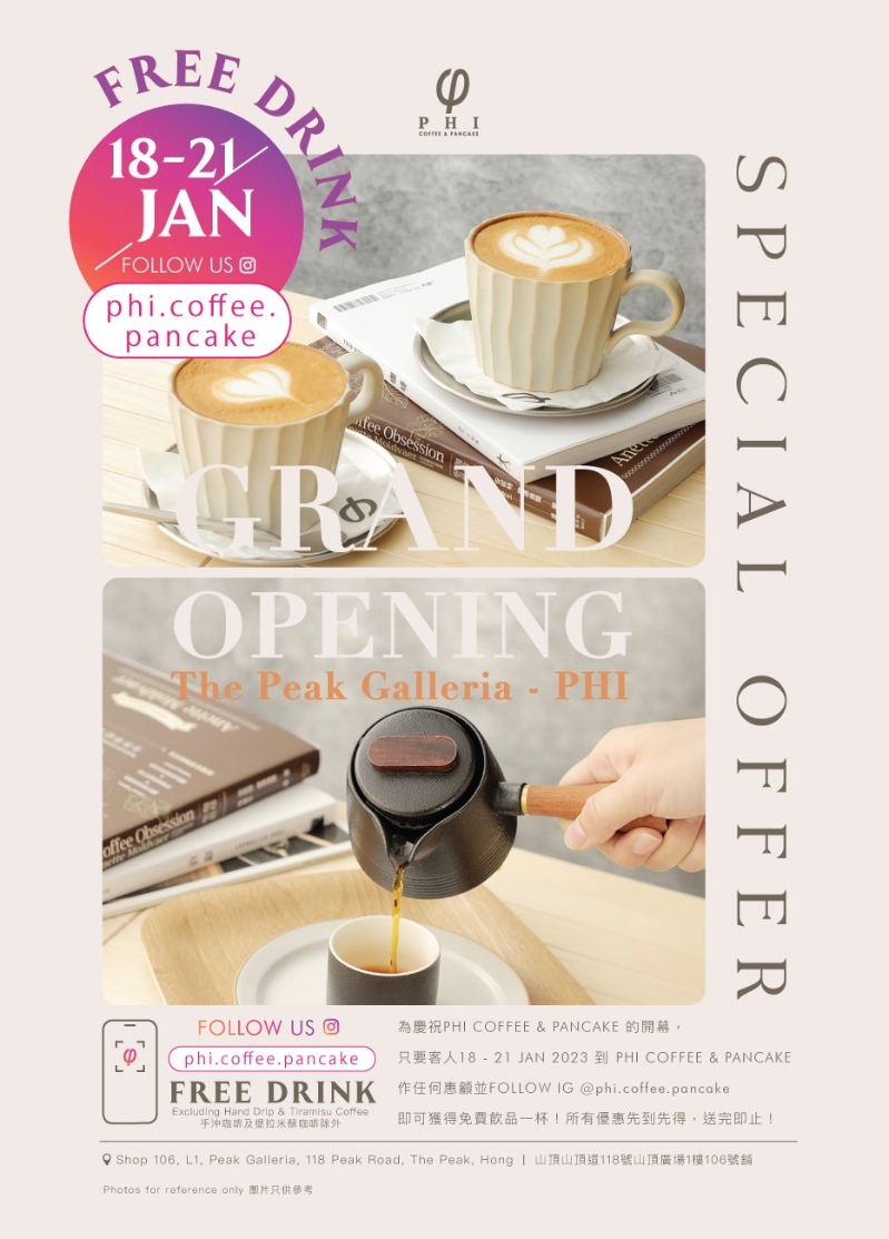 香港新聞網1月18日電 PHI Coffee & Pancake事隔一年後再度開設分店,今次開設的第五間分店今日(1月18日)正式開業,座落於山頂廣場。裝潢風格秉持清新而簡約的設計,店內充滿着奶油色調配搭及舒適闊落的空間,予人一種慢活享受的感覺,最適合嘆杯靚啡,讓客人放空一下。 為慶祝新店開張,現凡作任何惠顧並追蹤Instagram @phi.coffee.pancake,即可享有免費飲品一杯,優惠期由即日起至1月21日。