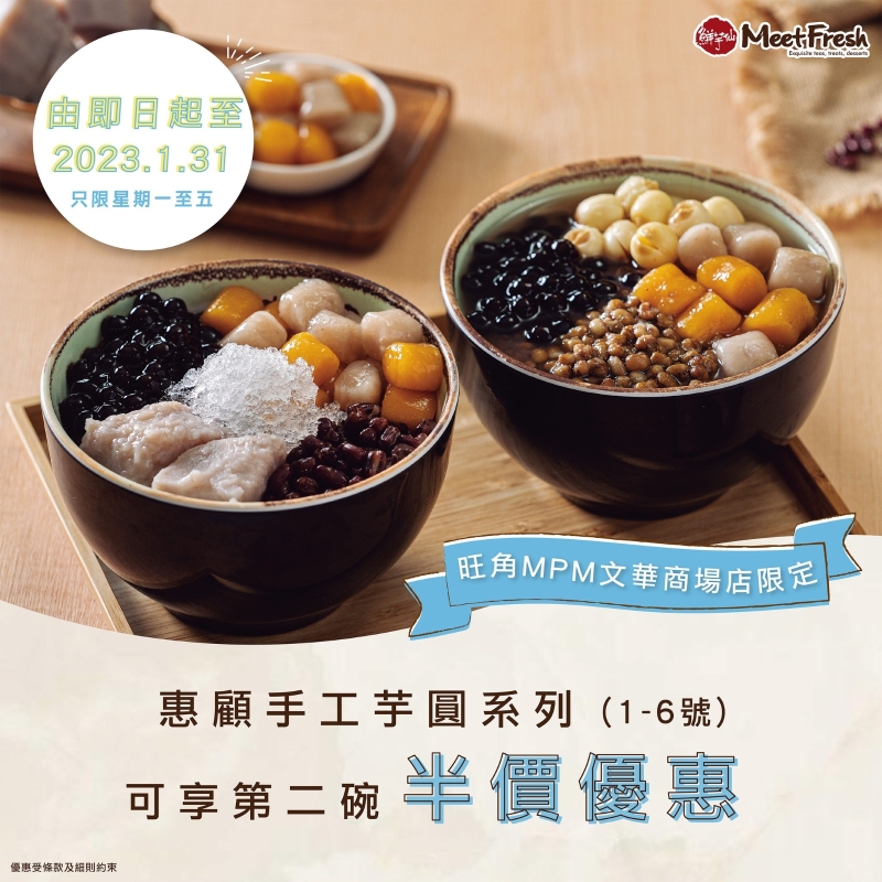鮮芋仙手工芋圓系列優惠涵蓋1至6號芋圓,包括香甜熱紅豆湯或原味刨冰底,搭配各款美味配料,每碗售價HK$45起,即HK$22.5起就可以歎到第二碗,超抵食!今次鮮芋仙芋圓優惠為旺角MPM文華商場店限定推廣,優惠於星期一至五全日供應,公眾假期除外,大家若有興趣記得前往品嚐喇! Meet Fresh 鮮芋仙香港第二碗半價優惠 優惠日期:即日起至1月31日(星期一至五,公眾假期除外) 優惠地址:旺角砵蘭街244號MPM文華商場1樓B舖(港鐵旺角站E1出口) 營業時間:中午12時至晚上10時30分
