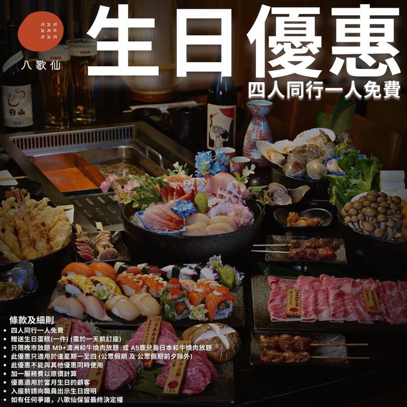 香港富麗敦海洋公園酒店提供生日入住驚喜 地址:香港仔海洋徑3號 電話:+852 2166 7388 6)八歌仙:4人同行1人免費 這間日本鐵板燒店主打燒肉放題,有Blackmore M9+澳洲和牛、A5熊本和王和牛等高質肉類。只需於生日月內逢星期一至四(非公眾假期)惠顧正價時段,4位起同行,壽星即可免費歎,再送1件生日蛋糕及1張即影即有照片。每枱只限一位使用優惠。(註:需提前訂座及說明使用生日優惠;使用優惠時需出示身份證明文件。所有人連壽星都需收取原價加一服務費。)
