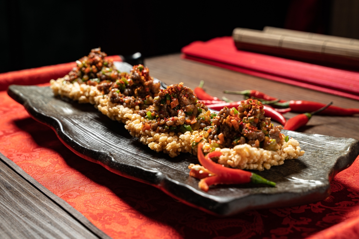 香辣羊崧鍋巴 天氣日漸回暖,不妨試試集口感和香味於一身的水晶羊肉凍前菜來揭開精彩序幕? 選用上等優質鮮羊肉,肉凍呈現油花分明的樸實風貌。另一款推介的串串羊,伴自家京蔥醬汁,惹味非常。客人亦可以加配啤酒一同享用。還有不能錯過的香辣羊崧鍋巴,香辣椒拌炒口感軟嫩的羊肉,再搭上香口脆米餅,讓人無法抗拒。