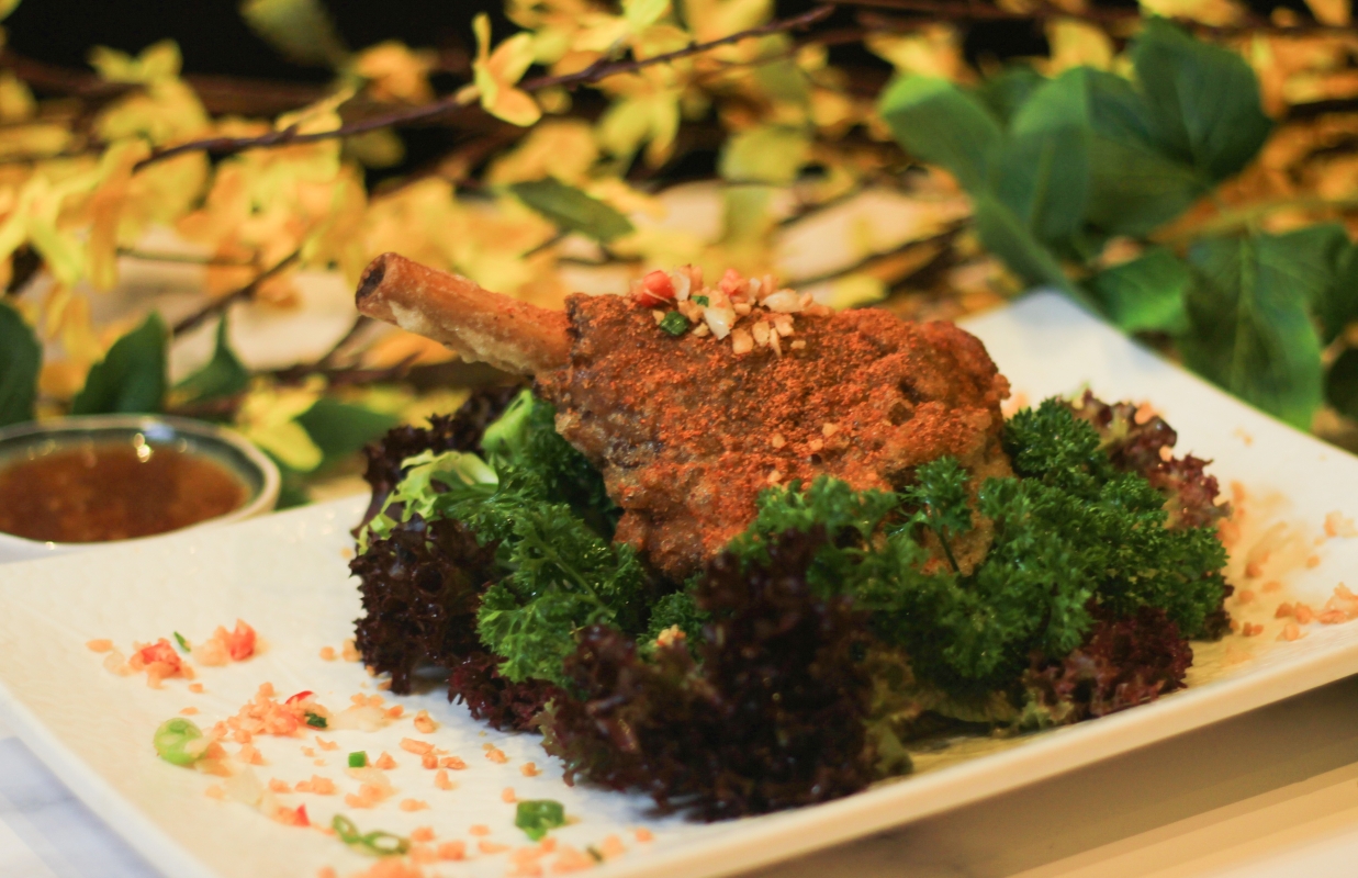 椒鹽脆皮小羊腿 主廚亦創造不同羊肉菜式,包括霸王羊架和椒鹽脆皮小羊腿。前者用上上等紐西蘭羊,以麻辣燙的自製混合香料和香辣醃製羊架;後者則以慢煮烹調方式使羊腿肉質達到最佳的嫩度,再加上惹味椒鹽,脆皮小羊腿完全是做到外脆內嫩,讓客人一試上癮。
