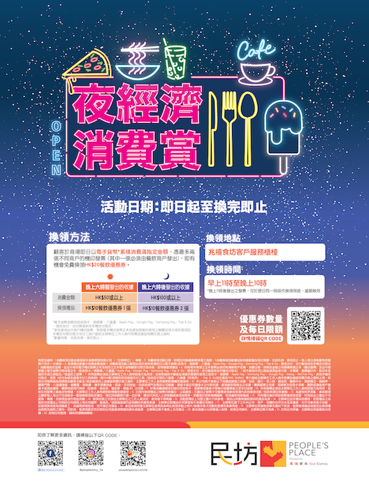 香港新聞網3月16日電 屋邨美食夜市是香港屋邨的特色之一,部分街市小食街更營業至深夜零時,是夜經濟活力的彰顯。民坊宣布,旗下26個商場將推出“夜經濟,消費賞”計劃,送出價值300萬元(港元,下同)餐飲優惠券。 活動期間,顧客於民坊旗下25個商場(太平邨商場、慈正商場、兆禧苑商場除外),即日晚上6時後以電子貨幣消費滿250元或以上(當中憑最多兩張不同商戶的機印發票,最少一張由餐飲商戶發出),即可換領2張價值20元的餐飲優惠券;消費滿幣150元或以上,亦可換領1張20元的餐飲優惠券。 至於屯門兆禧苑商場,即日晚上6時以後以電子貨幣消費滿100元或以上即可換領2張10元的餐飲優惠券;滿50元或以上,可換領1張10元飲優惠券。