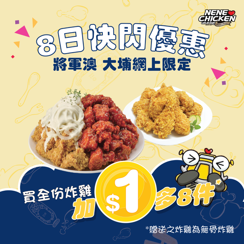 人氣韓式炸雞店NeNe Chicken快閃優惠!限時$1嘆8件無骨炸雞