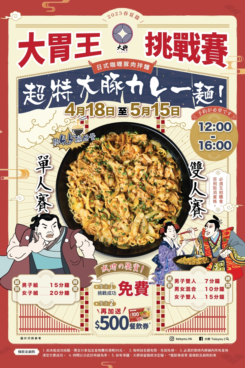 活動詳情 挑戰日期:4月18日至5月15日 可挑戰時間:中午12時至下午4時(由於人數限制須事先預約) 食物:日式咖喱豚肉拌麵(約4.5碗份量) 挑戰成功獎勵:免費享用日式咖喱豚肉拌麵,再加送HK$500大將餐飲券 報名詳情:4月17日起可於大將FACEBOOK / INSTAGRAM私訊或直接致電分店