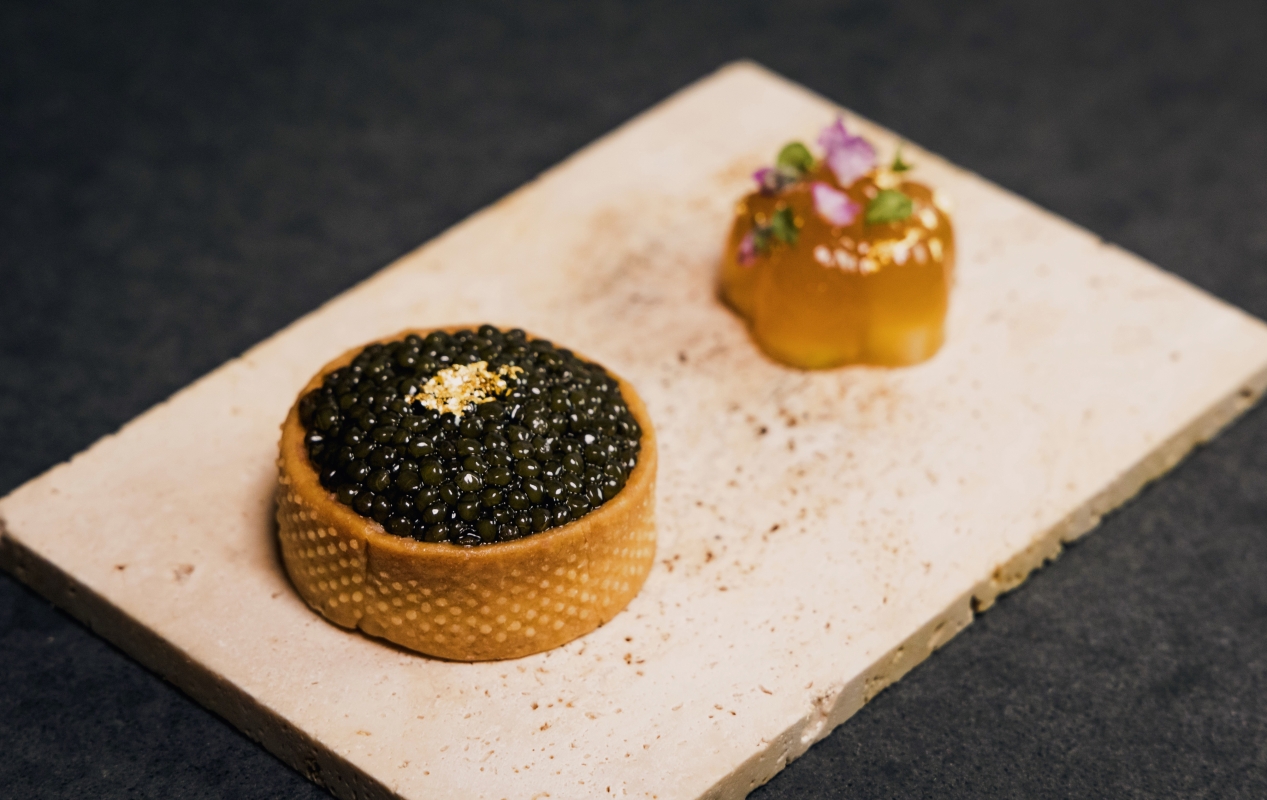 John Law(左)與Rania Hatoum將呈獻四手聯乘晚宴。 一連三天限時供應的四手聯乘晚宴將推出八道菜式嚐味菜單(HK$1,680/位),完美展現兩大主廚的手藝。首先由主廚Rania別具匠心的招牌魚子醬撻配鵝肝慕斯及香草忌廉為晚宴揭開序幕,再為客人呈上由主廚John精心設計的香柚味噌沙巴雍醬帶子,沁人心脾的柚子味噌沙巴雍醬配上鮮甜彈牙的帶子,味道清新開胃。緊接其後便有質嫩爽口的乳鴿串燒佐鮮腌蘿蔔及新鮮松露,乳鴿肉質鮮嫩飽滿,搭配口感特別的爆炸糖外皮,及以新鮮松露作點綴,盡顯精緻高貴。
