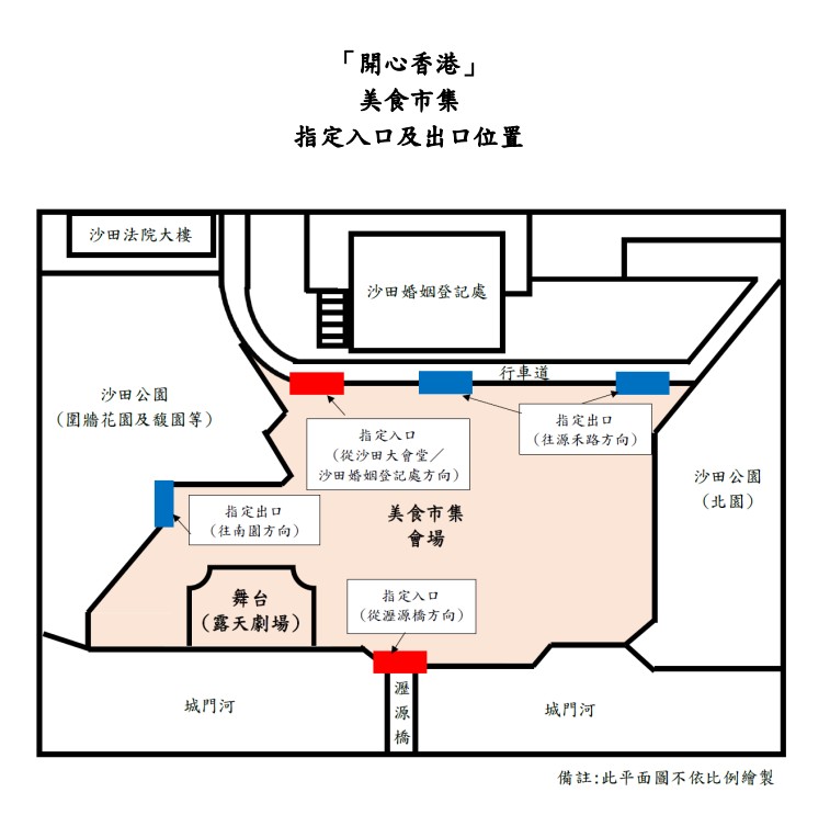 第二場“開心香港”美食巿集共設有約70個檔戶,以華夏及香港地道美食為主題。巿集亦設有多項精彩表演及兒童遊戲區,為市民提供周末消閒好去處。 沙田美食巿集的開放時間為5月6日及7日上午10時至下午6時。為疏導人流,期間通往瀝源橋及通往沙田公園近露天劇場的個别出入口會劃定為市集的指定“入口”及“出口”(見圖示)。 2023至24年《財政預算案》宣布啓動以市民為對象的“開心香港”活動,亮點之一是由民政總署在不同地區舉辦“美食市集”,讓市民及旅客享受中外美食。首場“開心香港”美食市集已於4月29日及30日在灣仔香港會議展覽中心順利舉行。第三場“開心香港”美食巿集將於6月3日及4日在觀塘海濱“發現號”舉行,巿民可免費入場。 有關活動詳情,請瀏覽民政事務總署網頁www.had.gov.hk。 【編輯:黃璇】