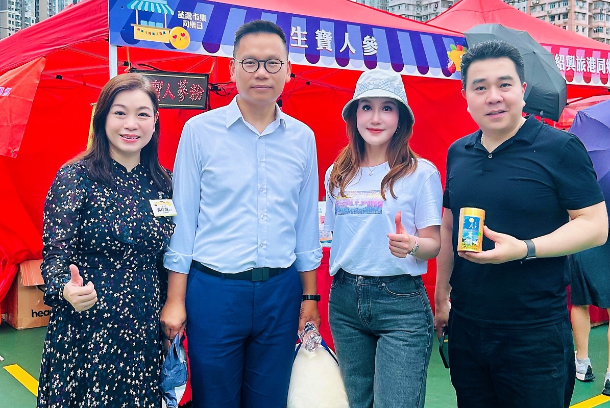 香港生寶集團董事蔡燕珊(右二)、總經理蔡嘉達(左)、全港各區工商聯執行副主席、啟德工商聯主席方子康(右)、荃灣工商聯主席蔡少霖(左二)在“荃灣周未市集2023 ”攤位上推介產品。