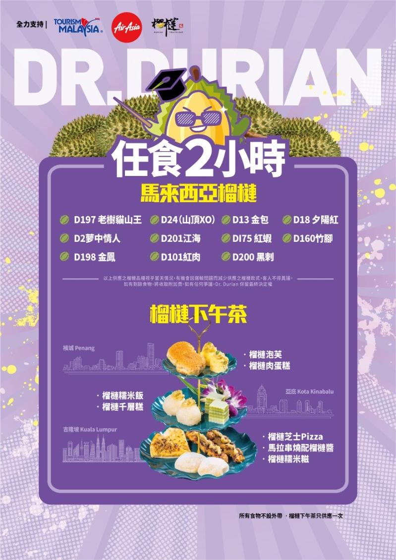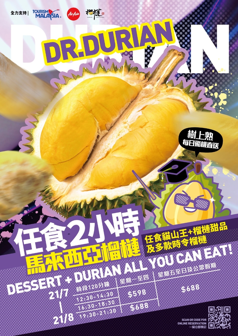 有品牌將於7月下旬推出馬來西亞榴槤放題。 品牌供應的榴槤包括D197老樹貓山王、D24(山頂XO)、D13金包、D18夕陽紅、D2夢中情人、D201江海、D175紅蝦、D160竹腳、D198金鳳、D101紅肉及D200黑刺。各款榴槤將按時令不定時供應,每日供應6至8款,款式均有不同。 除了任食榴槤外,客人還可以吃到以新鮮的榴槤果肉自家製作的榴槤下午茶(每人1份),包括榴槤泡芙、榴槤肉蛋糕、榴槤糯米飯、榴槤千層糕、榴槤芝士Pizza、馬拉串燒配榴槤醬及榴槤糯米糍。 所有惠顧的客人可以參與有獎游戲贏取獎品,當中包括由AirAsia送出的香港來回馬來西亞三大人氣航點的雙人來回機票(不包括相關稅項及附加費),包括吉隆坡、亞庇(沙巴)及檳城(名額3位),還有由馬來西亞旅遊促進局(香港分局)送出的禮物,包括旅行頸枕及手工番梘等。 只要保留消費單據,即可於參與遊戲贏取獎品,活動詳情可參閱場內宣傳物品,只需掃描QR Code即可連結至指定網址。
