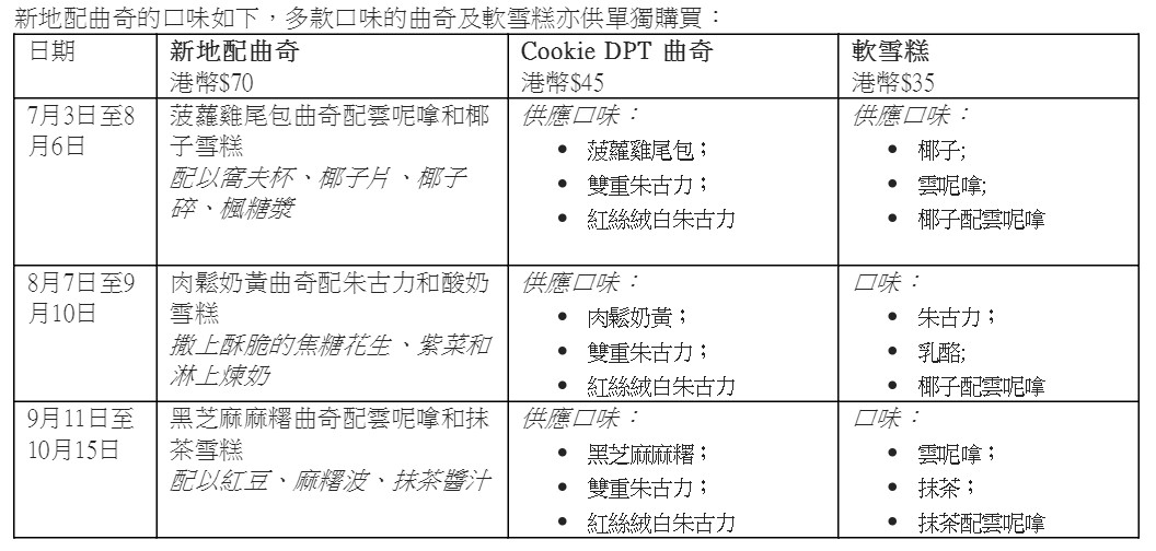 香港新聞網7月4日電 “曲奇控”想必對Cookie DPT不會陌生啦!香港維港凱悅尚萃酒店(Hyatt Centric)最近與香港知名烘焙品牌Cookie DPT合作,由Cookie DPT及酒店甜點總廚Kevin Leung共同創作,打造了三款適合夏天的新地配曲奇:菠蘿雞尾包、肉鬆奶黃及黑芝麻麻糬口味。每種曲奇口味都搭配了經精心挑選的軟雪糕口味和配料,並以酥脆的窩夫杯盛載。限量版新地配曲奇每份定價為HK$70,可由即日起在The Farmhouse Deli餅店(西座2樓)享用,每款限定口味發售為期5周。立即到訪網上商店以8折優惠購買新地配曲奇!