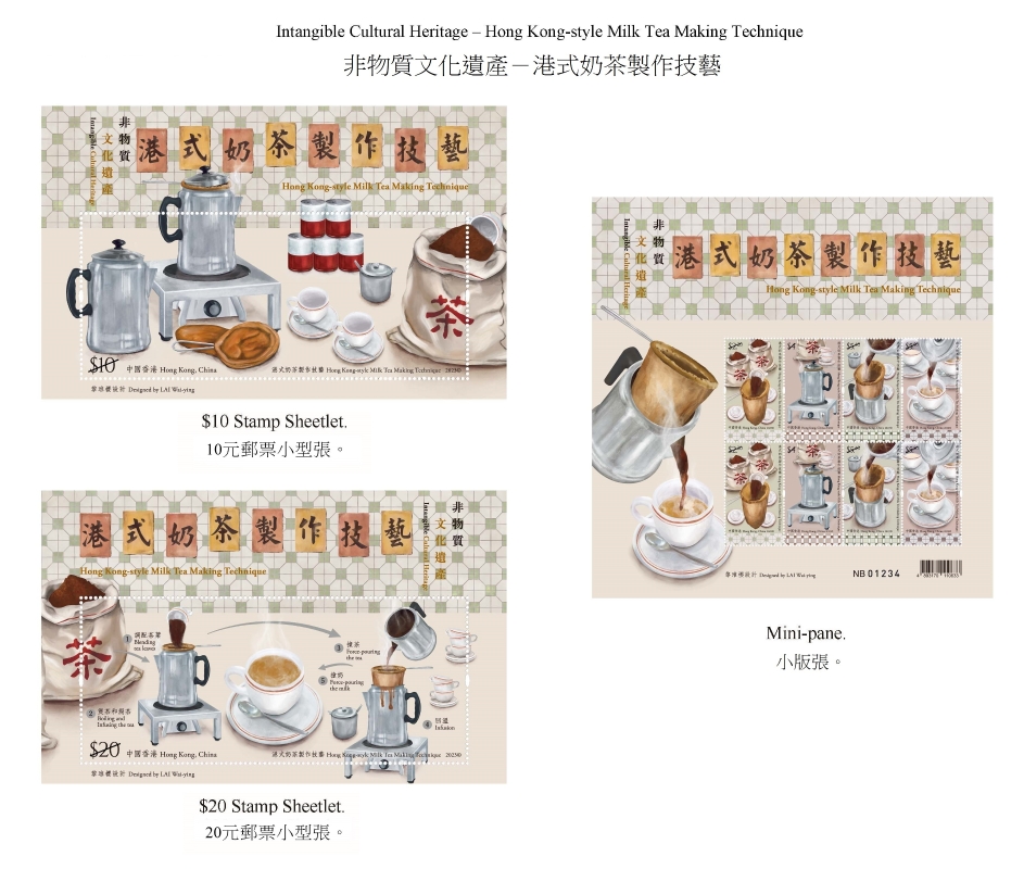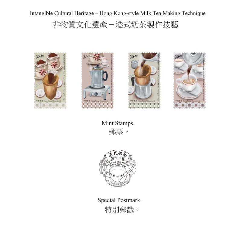 郵票和特別郵戳。 港式奶茶製作技藝於2017年成為首批列入“香港非物質文化遺產代表作名錄”的項目。深受香港人喜愛的港式奶茶,因用來隔走茶渣的白布袋經重複使用後染上茶漬而變啡,仿如絲襪,故俗稱“絲襪奶茶”。港式奶茶由英式奶茶經過百年演變而成,其製作技藝既反映了中西飲食文化在香港的交融與發展,也反映了本地市民的生活和飲食的面貌。