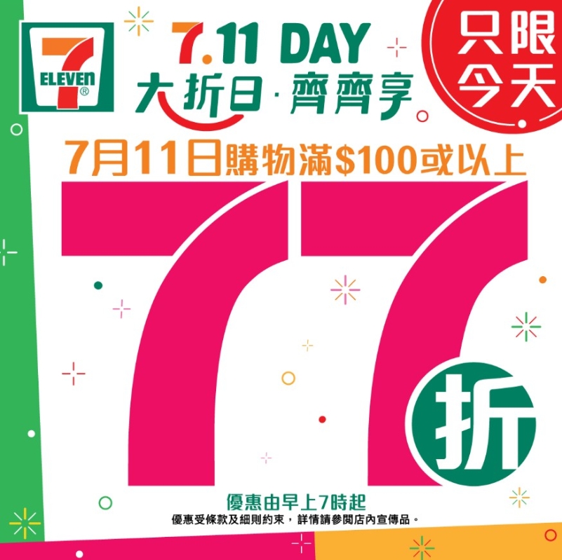 香港新聞網7月11日電 一年一度“7.11大折日”又到啦!7月11日(今日),7-11推出一連串驚喜優惠,只需買滿HK$100或以上即可享77折優惠,更可以配搭今期多款精選著數優惠使用,齊齊享有折上折優惠。