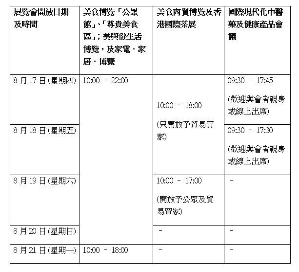 美食博覽及同期活動將於明日(8月17日)開鑼。圖爲2022美食博覽盛況。 而家電.家居.博覽將展示琳琅滿目的創新智能家居用品、廚房電器、廚具、餐具及家庭用品,包括手提蒸氣掛熨機、高智能互動機械人等,從產品外形、功能以至配套等,皆能為家居生活注入新意念。 同時,香港國際茶展的展商也將為公眾帶來多元化和高質素的特色產品,例如現代版潮洲工夫茶、有機伯爵紅茶等,各式茶香撲鼻而來,茗茶愛好者定必也能覓到心頭好。 除了盡享購物及飲食樂趣,還可參與多項精彩活動,包括美食博覽的星級名廚的示範、美與健生活博覽中由香港心聆會舉辦的“精神健康之入門”分享會、秋冬妝容示範等。