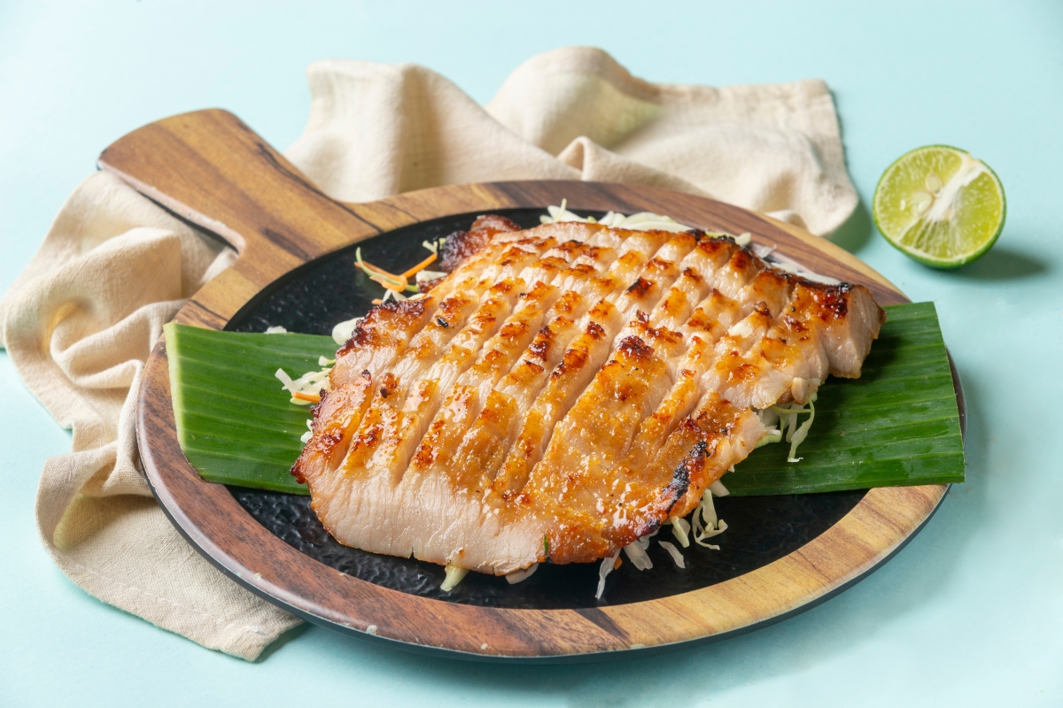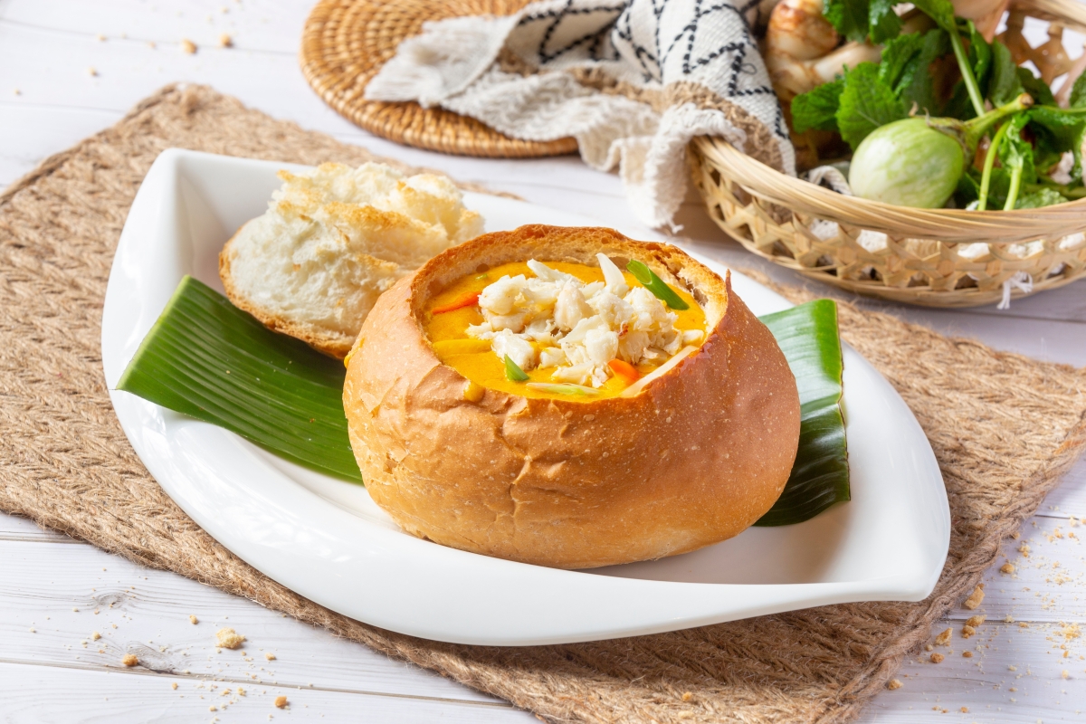 泰式蟹肉咖喱配農夫包。 “炭燒泰式串燒”及“炭燒泰式豬頸肉”都是當地必吃的美食,也是香港人吃泰菜必點的前菜之一。串燒先以泰式調味醃製半日,落單即點即燒,配上自家製沙嗲汁,襯托出最佳的風味和口感;豬頸肉先把魚露、椰糖、和蒜頭等製成醃料,醃製豬頸肉約12小時後再將其焗至金黃脆口,配上自家製泰式酸辣蘸汁,風味絕佳,令人吃不停口。
