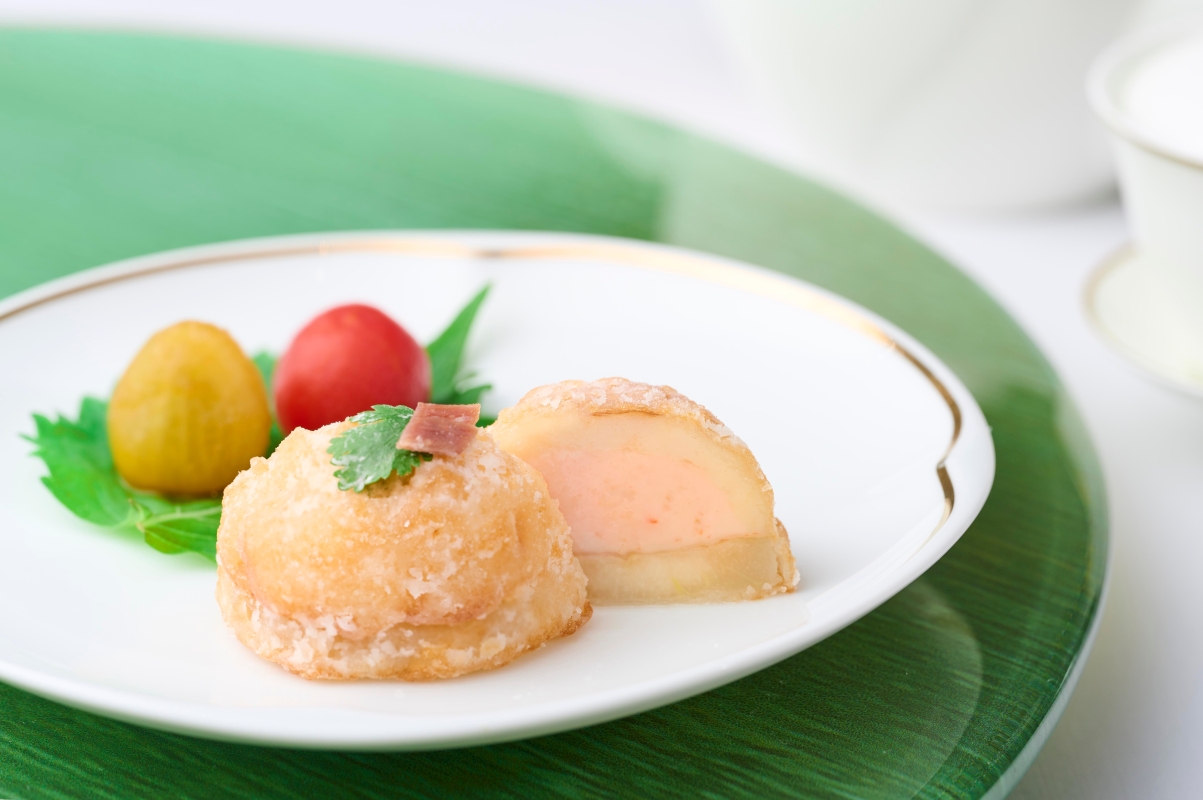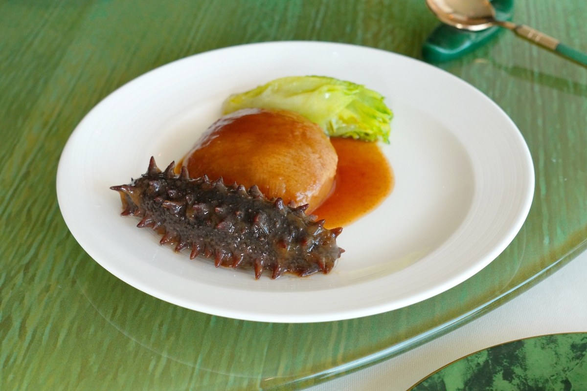 蝦籽柚皮扣關東遼參。 秋日美饌盛宴以龍帶玉梨香伴柚子醋車厘茄掀開序幕。賴師傅在醃製去皮車厘茄時,特別將柚子汁和話梅加入韓國醋,以平衡酸甜滋味。他亦將嫩滑的帶子及龍蝦膠配以蝦醬,突顯這兩款海產食材的鮮甜風味,再配合雲南火腿的鹹香與新鮮梨子的清甜,有畫龍點睛之效。四項食材疊起後油炸至外層酥脆,口感層次豐富,並配搭蜜梨將海鮮風味完美昇華。