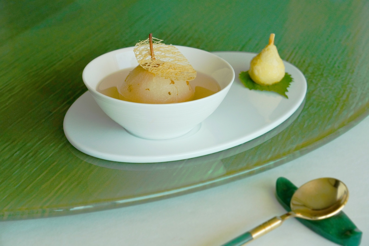 川貝燉原個津梨。 蟹肉冬茸燴燕窩採用新鮮手拆藍蟹肉,以及從原個蒸冬瓜中央取出的綿密冬茸。兩者加進濃郁的上等火腿雞湯之中,再添上份量十足的燕窩,口感綿密香醇亦具有滋補潤燥之效。 蝦籽柚皮扣關東遼參不僅將海陸時令食材和諧結合,更彰顯粵菜精髓,是賴師傅的匠心傑作。海參在美味的蠔油蝦籽醬汁中細火慢燉,形成爽滑軟糯的絕佳口感。而柚皮需要至少提前兩天準備,經過泡水、用豬油炸至鬆化、以濃湯燜煮等多重工序,雪白的柚皮逐漸變成鬆軟的海綿狀,完全吸收蠔油中的鮮味。 蒸魚可謂傳統粵式盛宴的必備菜式。賴師傅秘制的柚子豉油味道清新酸爽,更能帶出蒸魚鮮嫩細滑的口感,為柚子豉油蒸星斑球增添獨特風味。濃湯浸絲瓜浸鮮蝦仁之中的金黃色濃郁上湯的成功秘訣在於用雞骨、鴨骨和豬皮精心熬製,再以新鮮蝦仁配搭軟滑的絲瓜,味道一絕。賴師傅另一得意之作——肉骨茶小籠包源自新加坡“玉”的招牌菜,賴師傅為經典的小籠包精心改良,餡料內加入充滿胡椒和藥材風味的東南亞肉骨茶,並釀於透薄的小籠包皮之中,以完美火候蒸熟上桌。 “玉”的秋日美饌盛宴將以川貝燉原個津梨作結。清香的津梨和川貝具有暖心潤肺的功效,再以桂花蜂蜜提升滋味。這款中式津梨甜品配有造型可愛的迷你梨子酥,為秋日美宴畫上圓滿句號。 秋日美饌盛宴由即日起供應至10月31日,最少二位起入座。 【編輯:黃璇】