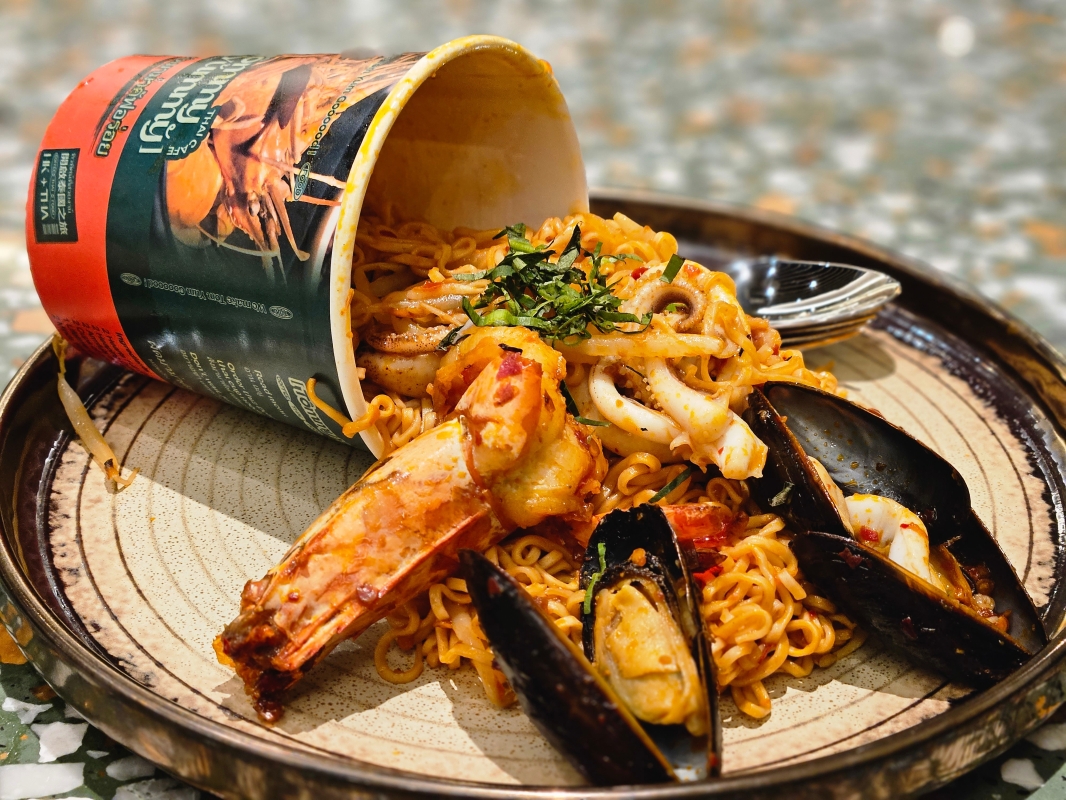 香辣海鮮蝶豆花飯(中)。(圖片:主辦方提供) 虎蝦海鮮混亂杯麵 在中環店頗受歡迎的虎蝦海鮮混亂杯麵,同樣登陸康城分店,材料豐富有虎蝦、青口及魷魚等海鮮,酸辣的味道配彈牙麵條特別惹味;加上造型搞鬼,無論賣相與味道均有驚喜。