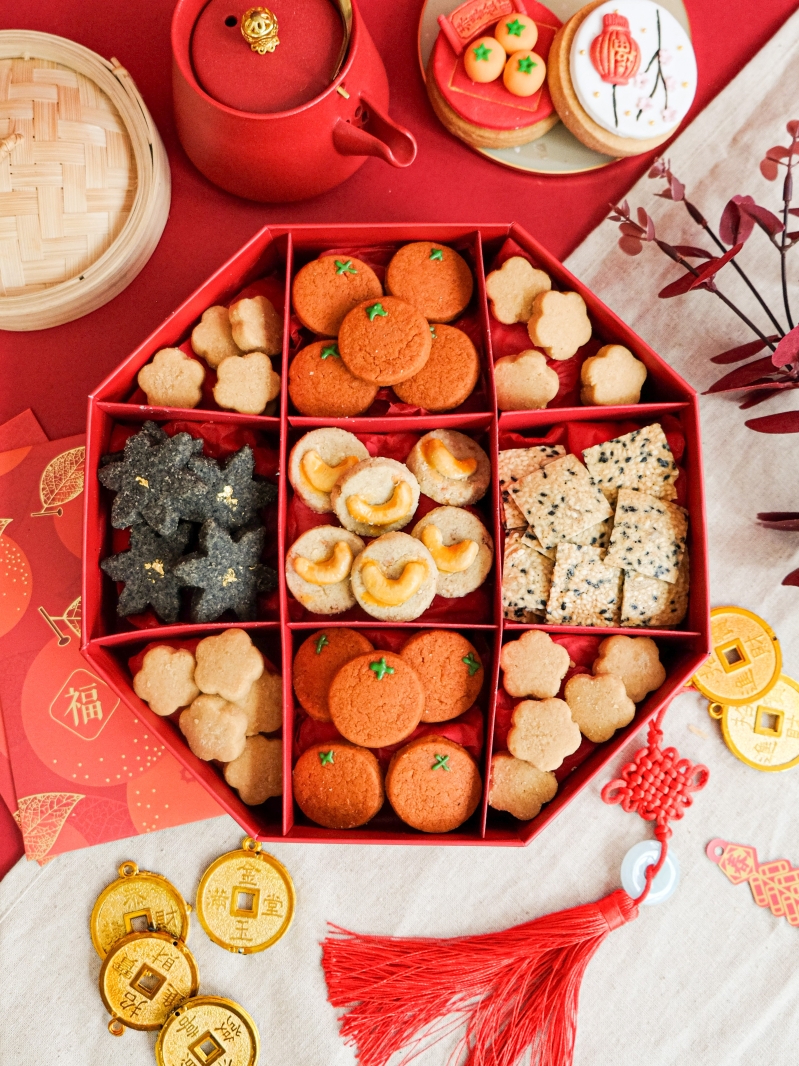 招財貓敲敲蛋糕。 幸運龍翻糖曲奇禮盒以吉祥紅色圓盒盛載,是農曆佳節饋贈親友的佳品。曲奇附有中國新年元素的圖案,包括吉祥“福”字,喜氣洋洋。無糖農曆新年全盒,內含五種不同口味的無糖曲奇,包括花生酥餅乾、黑芝麻曲奇、腰果餅乾、芝麻脆片和柳橙餅乾。精心製作的曲奇全盒,達致口感和質感的平衡,兼顧健康。
