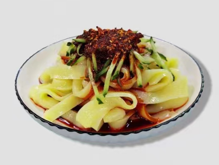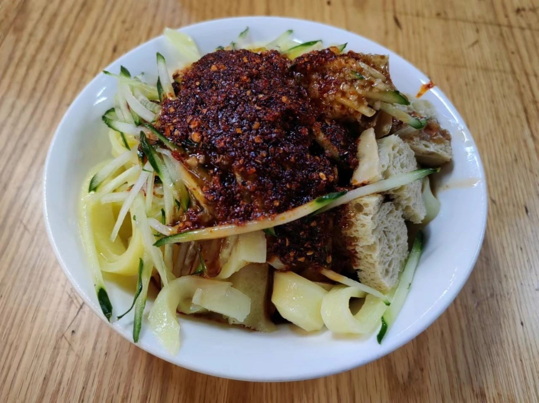 釀皮是天水著名的地方風味小吃,天水幾乎每條街巷都有賣釀皮子的小館、小攤。 天水釀皮,具有悠久的歷史和獨特的製作工藝。其做法是將麵粉用涼水和成硬團,然後在清水中揉搓,使麵粉中的蛋白質和澱粉分離。澱粉沉澱後傾去清水,加放食鹼,調成麵漿,舀入平底盤上籠蒸熟成片。蛋白質則另外蒸熟,切成薄片,隨碗搭配。 製作過程包括選材、浸泡、磨漿、過濾、沉澱、蒸煮、晾曬等多個步驟,每一個環節都需要精心操作,才能保證最終美食的質量。 在食用時,加上油潑辣椒、精鹽、醬油、蒜泥、芥末、香醋、芝麻醬等調料,使得釀皮的味道更加豐富、辣香。品嚐時,會感受到釀皮質地柔嫩、滑爽,口感獨特,百吃不厭。 除了傳統的吃法外,天水釀皮還可以與其他食材相搭配,如黃瓜絲、豆芽、土豆絲等,製作成多種不同風味的涼菜。現代廚師更是不斷創新,將釀皮與其他食材相結合,創造出更多新的菜品,不僅豐富了釀皮的吃法,也讓更多的人了解到了這種美食的魅力。 天水釀皮的歷史可以追溯到唐代以前,當時的皇帝李世民曾巡遊至此,品嚐了天水釀皮後讚不絕口,自此釀皮便成為了宮廷貢品。後來,釀皮從天水傳到長安,一度成為唐朝的“網紅美食”。