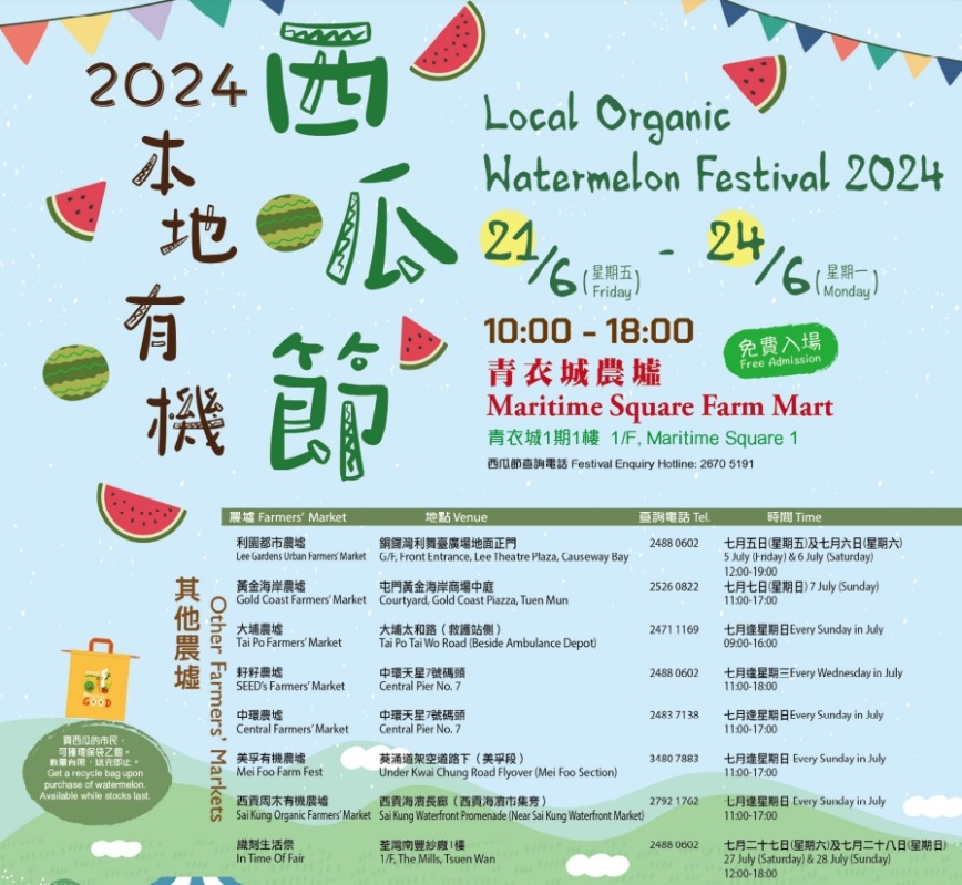 四個特色有機西瓜品種,分別為(左起)“超甜黑美人168”、“黛安娜”、“皇玉”和“無籽3F-2728”。 漁護署聯同蔬菜統營處、新界蔬菜產銷合作社有限責任聯合總社和港鐵公司合辦“2024本地有機西瓜節”首場為期4日的農墟活動。市民可於6月21至24日上午10時至下午6時於青衣城一期一樓選購本地有機農產品,於會場購買本地有機西瓜的市民更可獲贈精美禮品乙份。活動亦設有攤位遊戲及工作坊,為市民提供消閒好去處。 此外,漁護署亦繼續邀請恆常舉辦的有機農墟參與本地有機西瓜節。6月下旬起,市民可到不同地區的有機農墟選購本地有機西瓜及其他時令蔬果。市民亦可透過“本地魚菜直送”網頁(www.localfreshhk.com)及手機應用程式向蔬菜統營處訂購;或透過香港有機資源中心網頁(www.hkorc-cert.org),聯絡種植有機西瓜的認證有機農友購買。有關以上各農墟的開放日期和時間,可參閱下圖。