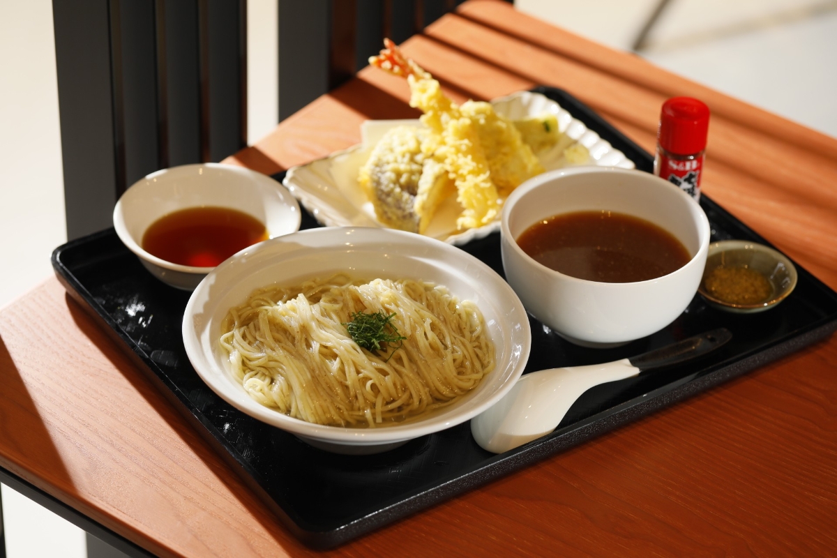 天婦羅盛合冷麥麵。 今次山本先生到港,更為THE SOUTHSIDE店研發期間限定的冷麥麵,獨家推出的“天婦羅盛合冷麥麵”,天婦羅包括海老、牡蠣、野菜,採用特製炸漿,以匠心新鮮即叫即炸,天婦羅經高溫油炸呈現金黃色,脆薄外層鎖住食材肉汁和香味,口感外脆內嫩。冷麥麵設有兩款湯汁,三種食法。第一口建議先將冷麥麵和店內自家製的凍昆布清湯一同直接享用,感受麵條本身的天然麥香和味道;第二口把浸泡在凍昆布清湯的冷麥麵,沾上以濃厚雞湯混合魚湯製作而成的沾麵汁享用,細嚐味道的微妙變化;第三口根據自己喜好,放上自家製的柚子汁或日本七味粉,享受另一番風味。吃完冷麥麵後,把剩餘的凍昆布清湯倒進沾麵汁裡,沾湯的風味和口感會慢慢變化,最後將湯汁一飲而盡,畫上完美句號。