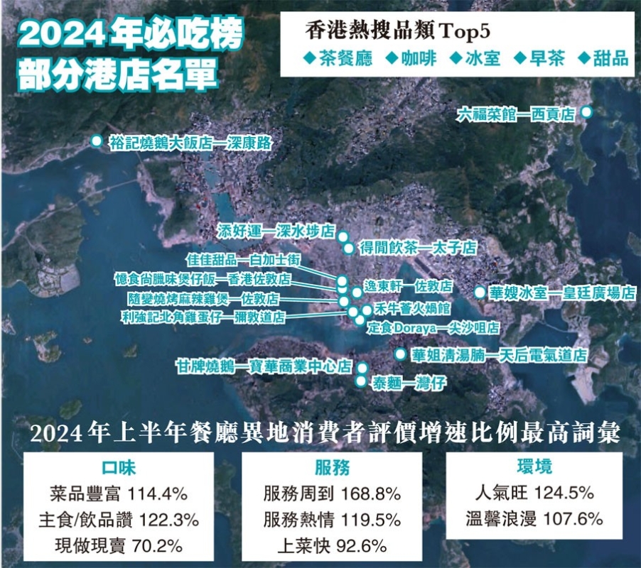 2024年必吃榜部分港店名單。(圖源:香港文匯報) 瀏覽香港登榜餐廳,包括香港歌手陳奕迅愛去的炳記茶檔等茶餐廳,亦有Fiata Pizza、Pica Pica等披薩及西班牙美食;此外,本地甜品、點心店同樣受歡迎,如佳佳甜品、新贊記點心皇都有上榜。港式料理方面,除茶餐廳外,包括燒鵝大皇、裕記燒鵝大飯店在內的燒鵝店鋪,亦有數家登榜。 特區政府文化體育及旅遊局局長楊潤雄表示,香港餐飲融合中國傳統文化和國際美食元素,呈現中西融合和多元化魅力,本次香港上榜餐廳包羅萬有,遍布港九新界,包括地道的小吃店,港式茶餐廳和不同地方的料理,在香港“無處不旅遊”之餘,更體現香港“無處不美食”。 旅發局未來計劃與大眾點評加強合作,向旅客推介最新、最全面的本地美食資訊、餐廳指南、獨家飲食情報等,以展現香港豐富的美食風貌、激發旅客的訪港興趣。 (完) 【編輯:黃璇】