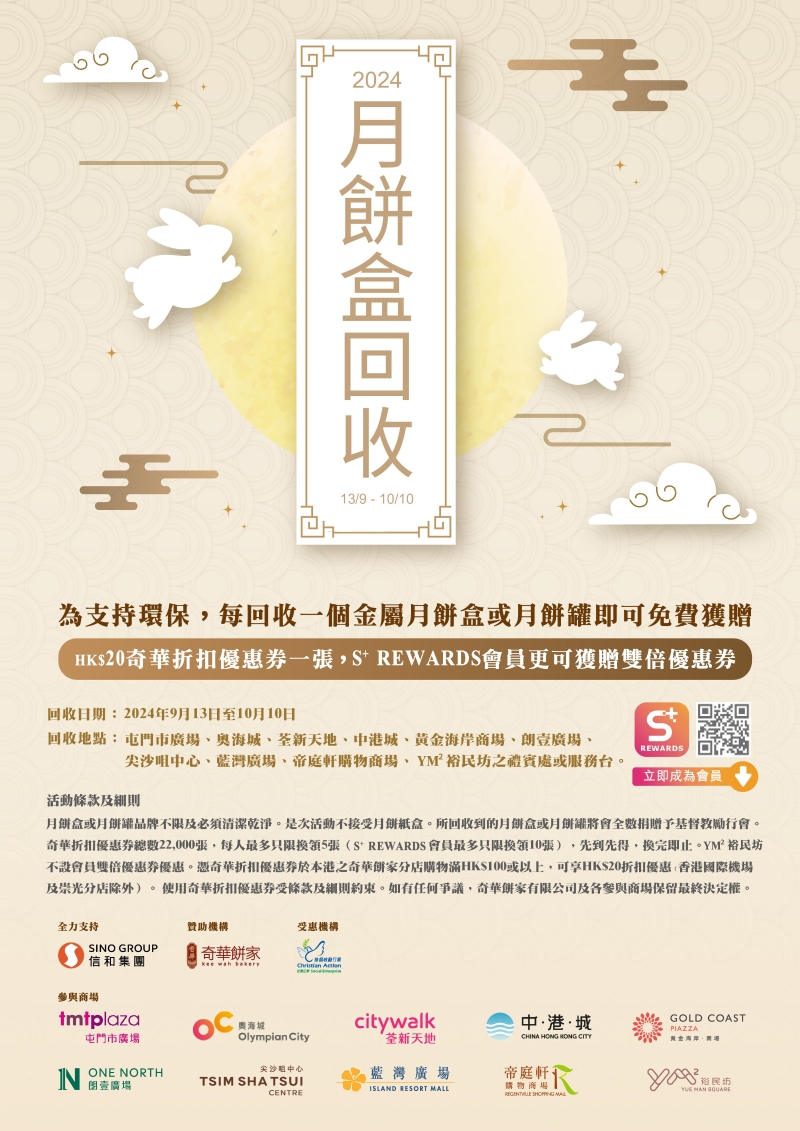 品牌並與信和集團旗下商場今年繼續合辦“中秋月餅罐回收計劃”,市民於9月13日至10月10日期間,將一個已妥善清潔的任何品牌金屬月餅罐,交到10個指定商場之禮賓處或服務台,即可獲贈折扣優惠券HK$20,而S⁺ REWARDS會員更可獲得雙倍優惠券。(完)