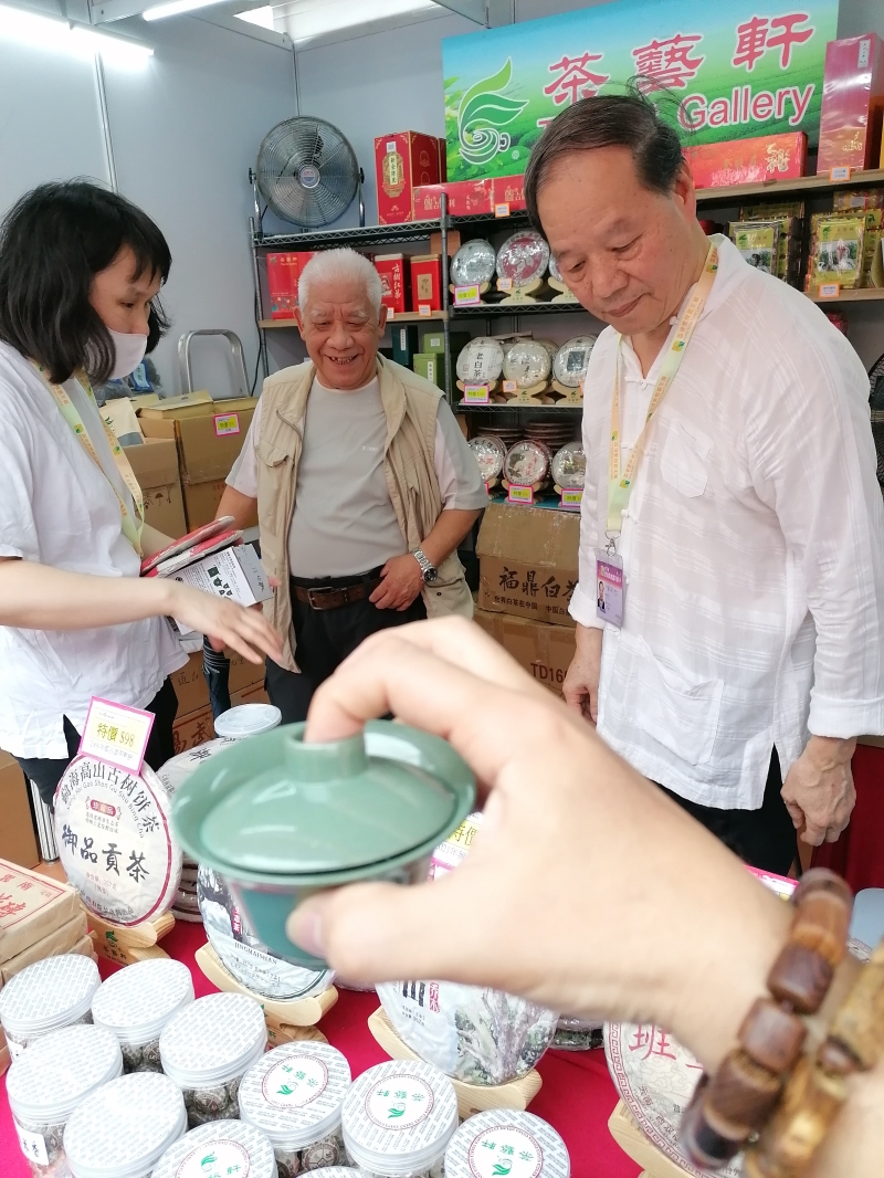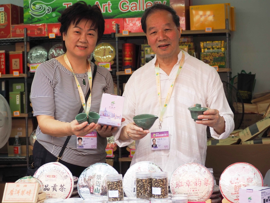 香港茶藝軒董事長劉正慶(右)介紹首次推出“便攜式環保茶具”