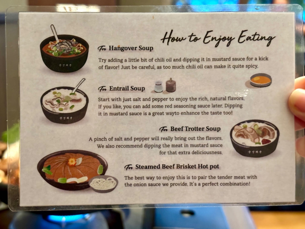 餐廳指導如何品嘗各款解酒湯。(香港中通社記者 黃璇攝) 解酒湯的歷史可以追溯到百多年前的仁川港,當時碼頭勞工會將剩餘的內臟、碎肉、骨頭熬成湯,留待隔天醒酒。隨著韓國的聚會文化和飲酒習慣,解酒湯成為當地人醒酒提神的良方。“韓鍋酒舍”的解酒湯種類繁多,其中最受歡迎的是牛肚解酒湯。這款湯以內臟為主料,加入牛骨、牛肉和蔬菜,熬煮數小時,並以韓式特調味料增鮮,湯頭清淡不腥。一碗熱騰騰的湯暖胃又醒酒,內含豐富的牛肚、嫩豆腐、芽菜、蘿蔔等,湯底微辣,鮮味十足。除了牛肚解酒湯,還有牛內臟湯、牛腩湯、牛蹄湯和餃子解酒湯等多種選擇,推薦加點白飯拌入湯中,吸收湯汁精華,愈吃愈滋味。