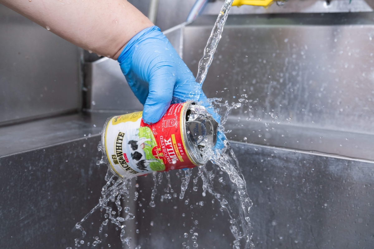 負責水吧的前線員工展示日常使用淡奶後,處理及清潔金屬罐的流程。