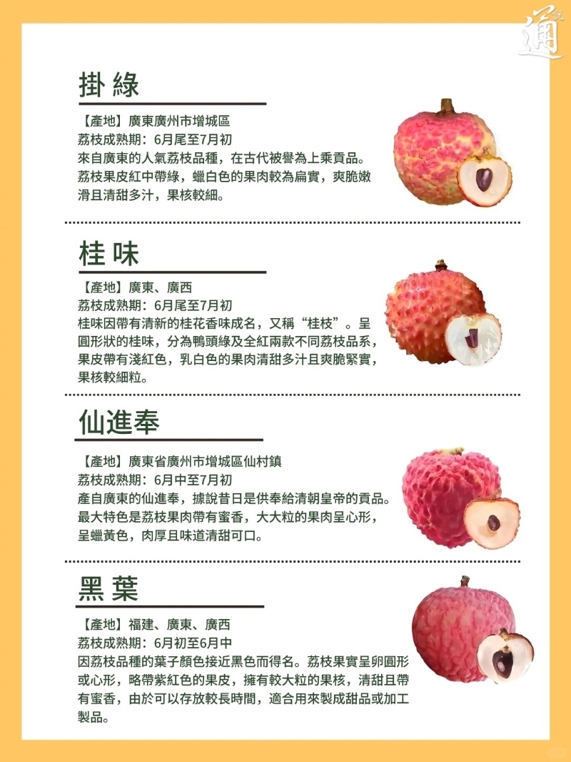 香港新聞網6月17日電  盛夏時節,又到了荔枝上市的旺季!市場上隨處可見紅豔飽滿的荔枝,但您知道嗎?荔枝品種多達數十種,不同產地、風味和口感都有明顯差異!香港新聞網特別整理“荔枝品種指南”,從常見的桂味、糯米糍,到名貴的仙進奉、觀音綠,詳細介紹各品種特色與產地,同時提醒哪些人群不適合食用荔枝,以及如何正確保存才能保持鮮甜。趕快來了解,成為荔枝達人吧!