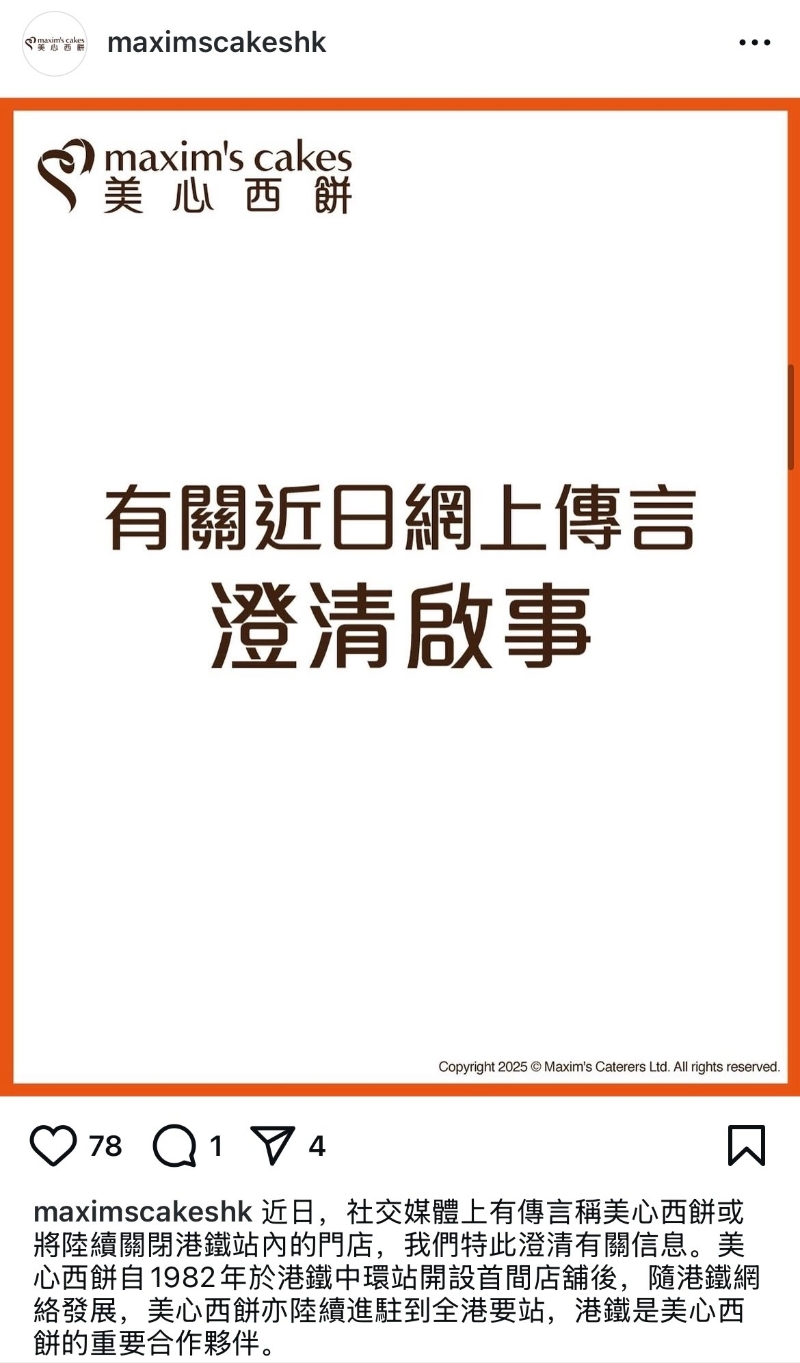 澄清關店傳聞,美心西餅強調對香港市場有信心。 澄清文章指出,美心西餅自1982年於港鐵中環站開設首間店舖,而該品牌亦剛於7月在港鐵金鐘站開設一家全新的概念店。美心西餅表示,該品牌一直以來根據市場狀況規劃店舖發展策略,未來一年,將陸續在各區開設新店。 美心西餅在文末強調,該品牌紮根香港,對市場前景充滿信心,並會持續優化產品及服務,為顧客提供更好的購物體驗。 據美心西餅網站,該品牌在港鐵站內現時共有超過40間分店。而美心西餅所屬的美心集團亦有多個餐飲品牌在港鐵站內設店,包括快餐店美心MX、咖啡店星巴克等。(完) 【編輯:黃璇】