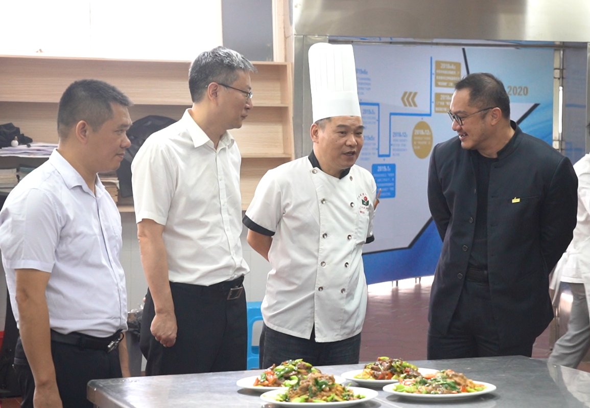 是次課程與廣東省粵東技師學院合作,該校為省級“粵菜師傅”工程培訓基地,中華廚藝學院院長葉漢鵬(右一)親自與當地師傅交流教學心得。