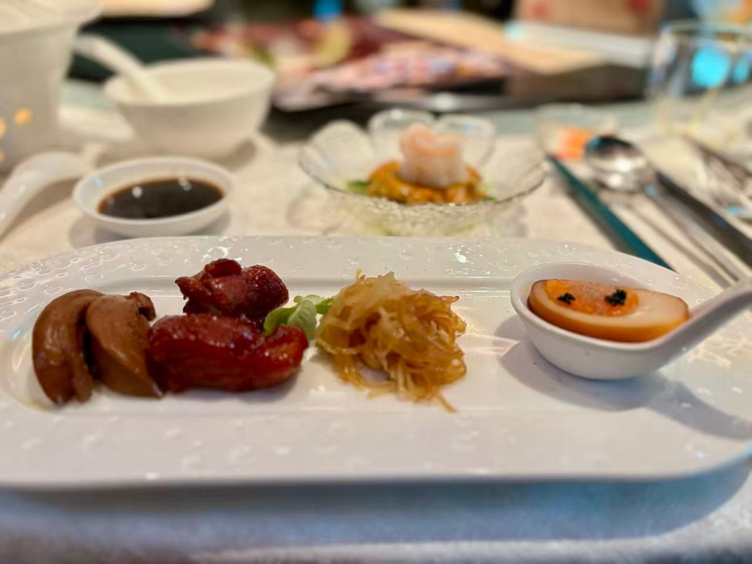 前菜四小碟。(香港中通社記者 黃璇攝) 前菜四小碟率先登場——糟香醉鮑魚微帶酒香,肉質彈牙;上海蔥油海蜇絲爽口開胃;糖醋小排骨酸甜不膩、煙燻溏心蛋則煙燻氣息分明,每一味都頗有江南細膩底蘊。