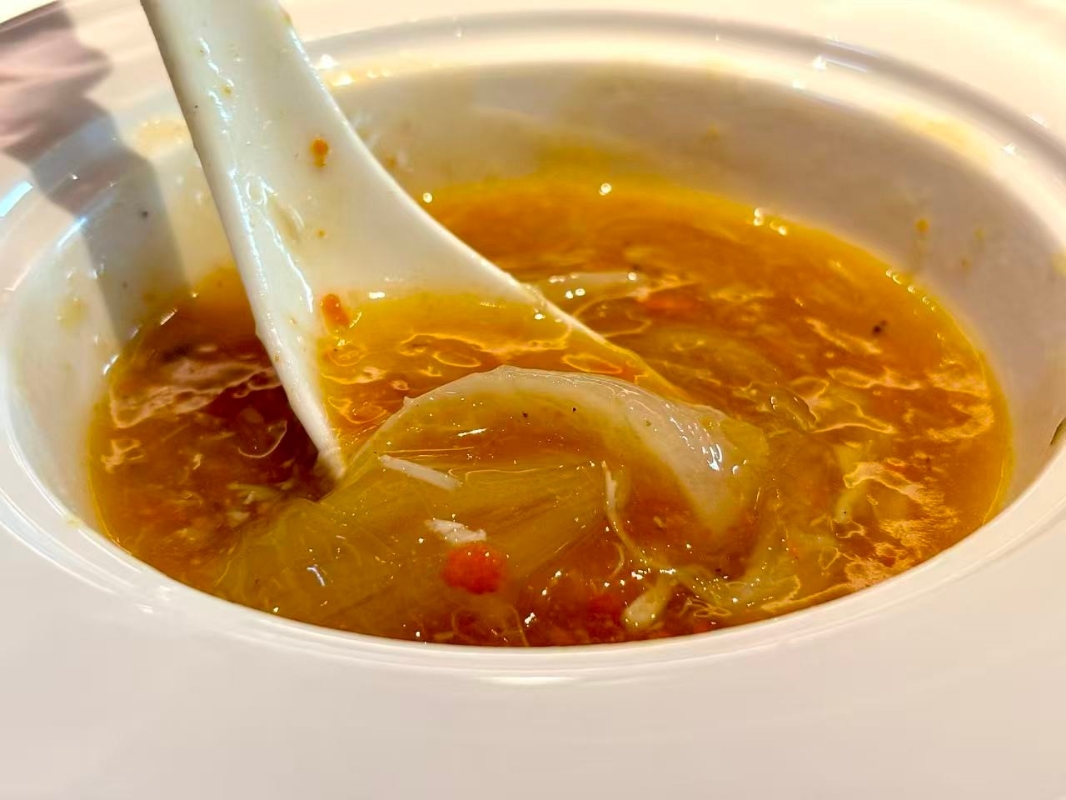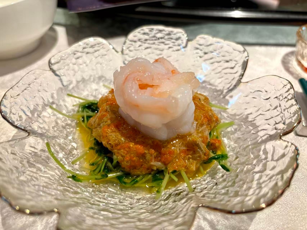 个園現拆蟹粉燴魚翅。(香港中通社記者 黃璇攝) 重頭戲是“个園現拆蟹粉燴魚翅”。蟹粉由師傅即場現拆,與老雞、火腿熬足六小時的雞湯交融,湯色金黃,入口是濃郁蟹鮮與膠質滑順交織,魚翅脆嫩,餘韻悠長。緊接的“蟹粉翡翠牡丹蝦球”則以虎蝦剖花油炸,外層酥脆、內裡彈牙,佐以蟹粉,將鮮味層層推上高峰。