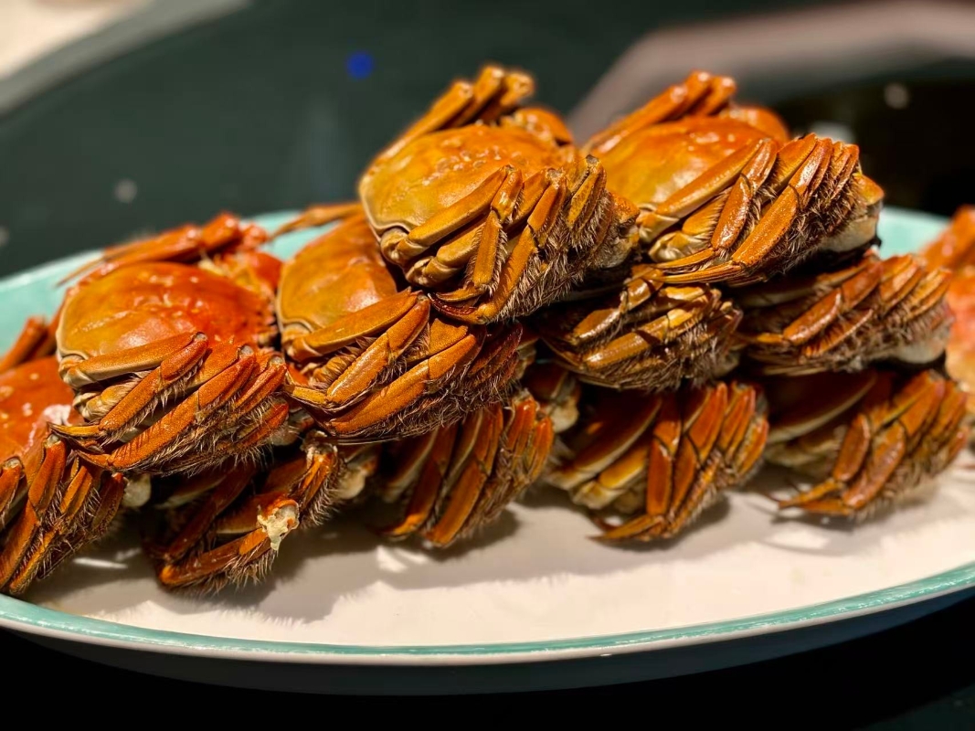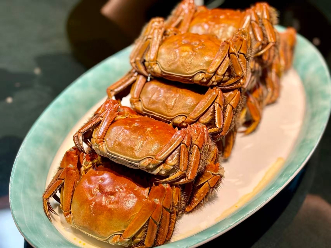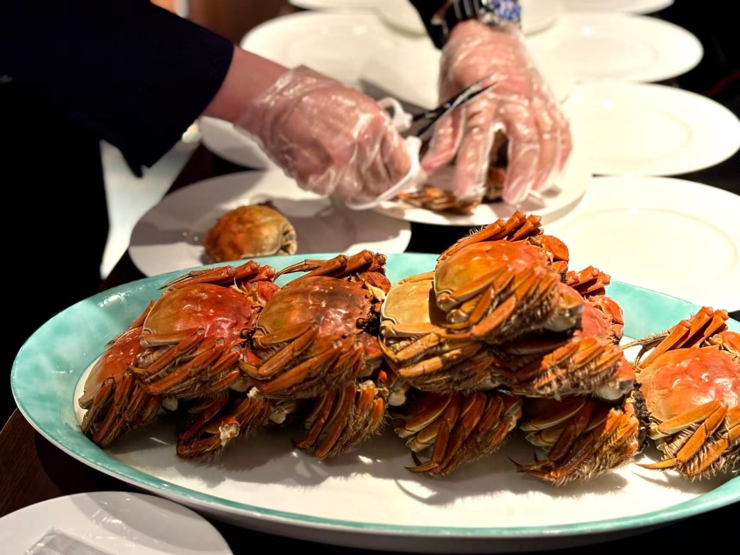 餐廳特設拆蟹服務。(香港中通社記者 黃璇攝) “私宴海派燻魚配芋餅”與“揚州蘿蔔扣花膠”則分別展現了滬與淮揚菜的傳統功夫。燻魚外酥內嫩,芋餅香氣細膩,兩者搭配恰到好處。蘿蔔扣花膠則以揚州蘿蔔心燜入味,配上軟糯花膠,口感溫潤細膩。